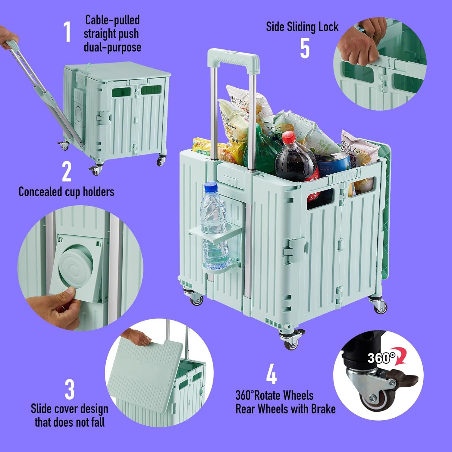 Folding Utility Cart Portable Rolling Crate Handcart Shopping Trolley Collapsible Tool Box, with Lid, on 4 Rotate Wheels, for Grocery, Shopping, Office, Camp, Teacher (Green)