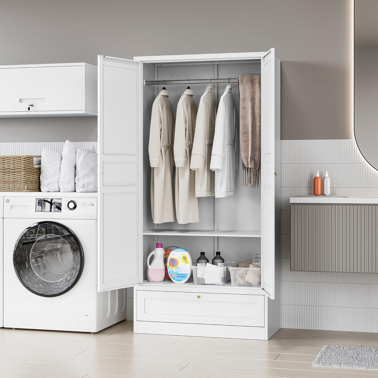MIIIKO Wardrobe Closet with Drawer, 2 Doors Clothes Cabinet, 72" Metal Storage Cabinets with Hanging Rod, Bedroom Armoires Laundry Room and Office Clothes Storage Organizer Cabinets