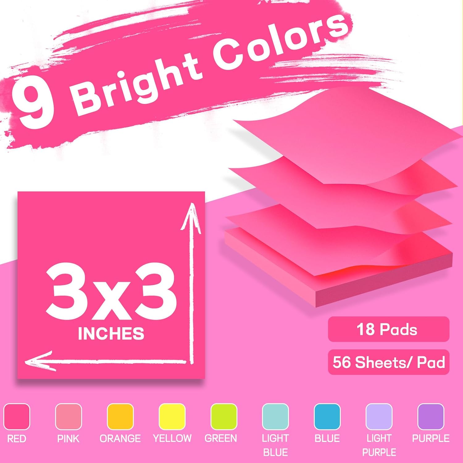 (18 Pads) Pop Up Sticky Notes 3x3 Refills, Strong Adhesive Memo Pad Bulk with 9 Bright Colors, Suitable for Home, Office, School, Clean Removal