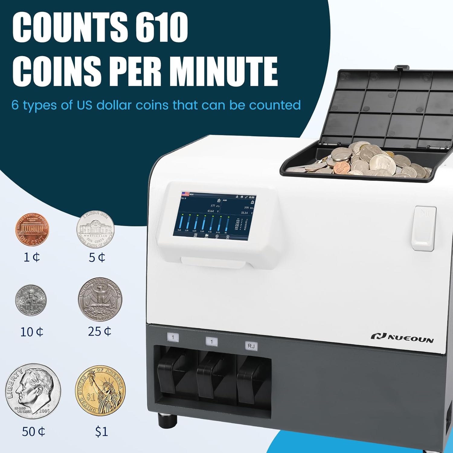 NUCOUN C200 Coin Counter Bank Grade, Heavy Duty 3-Pocket USD Coin Sorter,4.3-inch Touch Screen,High Speed 610 Coins/min, Printer Enable, Two-Year After Service