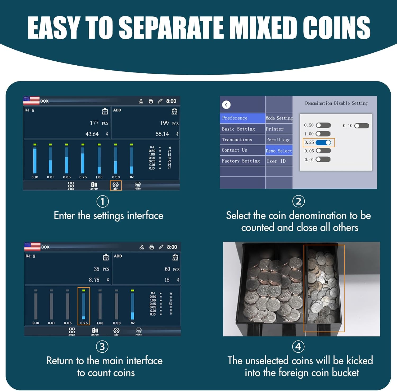 - Count and sort 6 different US dollar coins with ease using the C200 coin sorter's 2 genuine coin boxes and 1 reject box. Compatible with coin tubes and bags