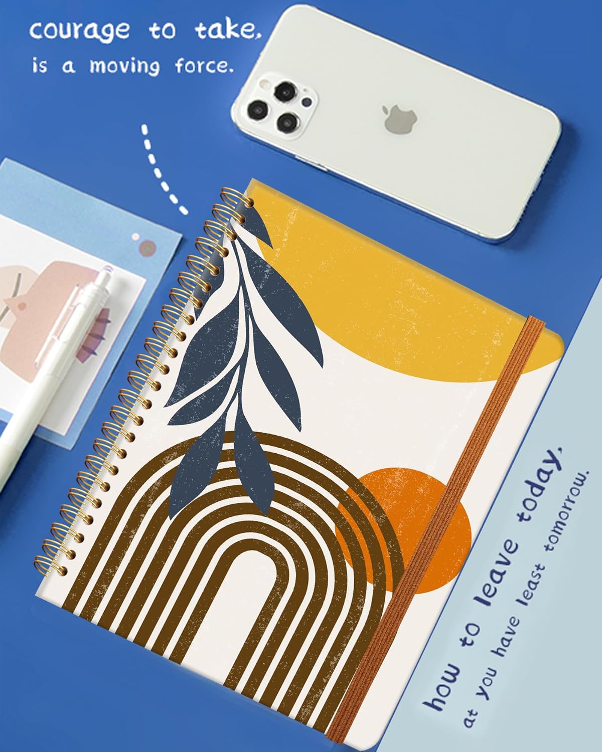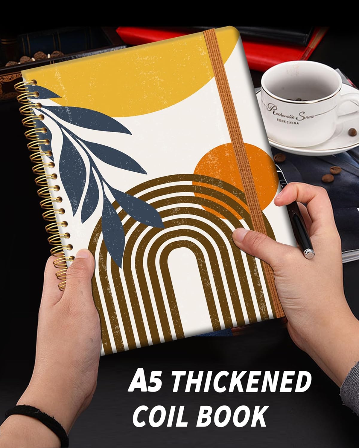 Ruled Spiral Writing Notebook,A5 Hardcover Lined College Journal for Women Lady,Fashion Puppy Watercolor Strong Twin-Wire Binding with Premium Paper,8.4" X 6",Perfect for School,Office,Home Gifts(Abstract Boho Sun Moon Leaves)
