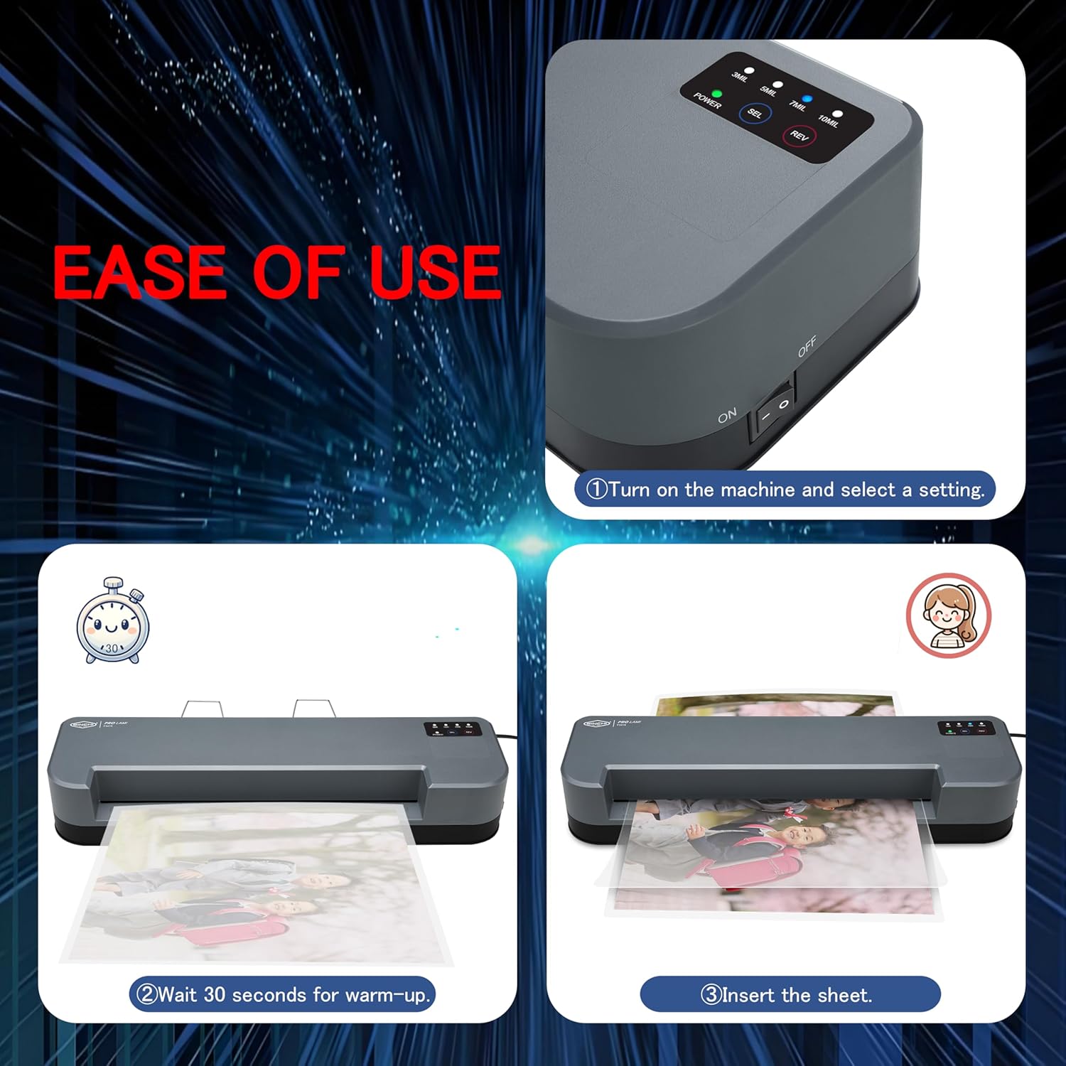 - 【High Productivity】The combination of 30-second warm-up & maximum 40 inches/minute speed saves you valuable time on lamination projects. It takes only four minutes to laminate ten 3-mil letter size pouches from being turned on. Ideal for home, office, school, and commercial use.
