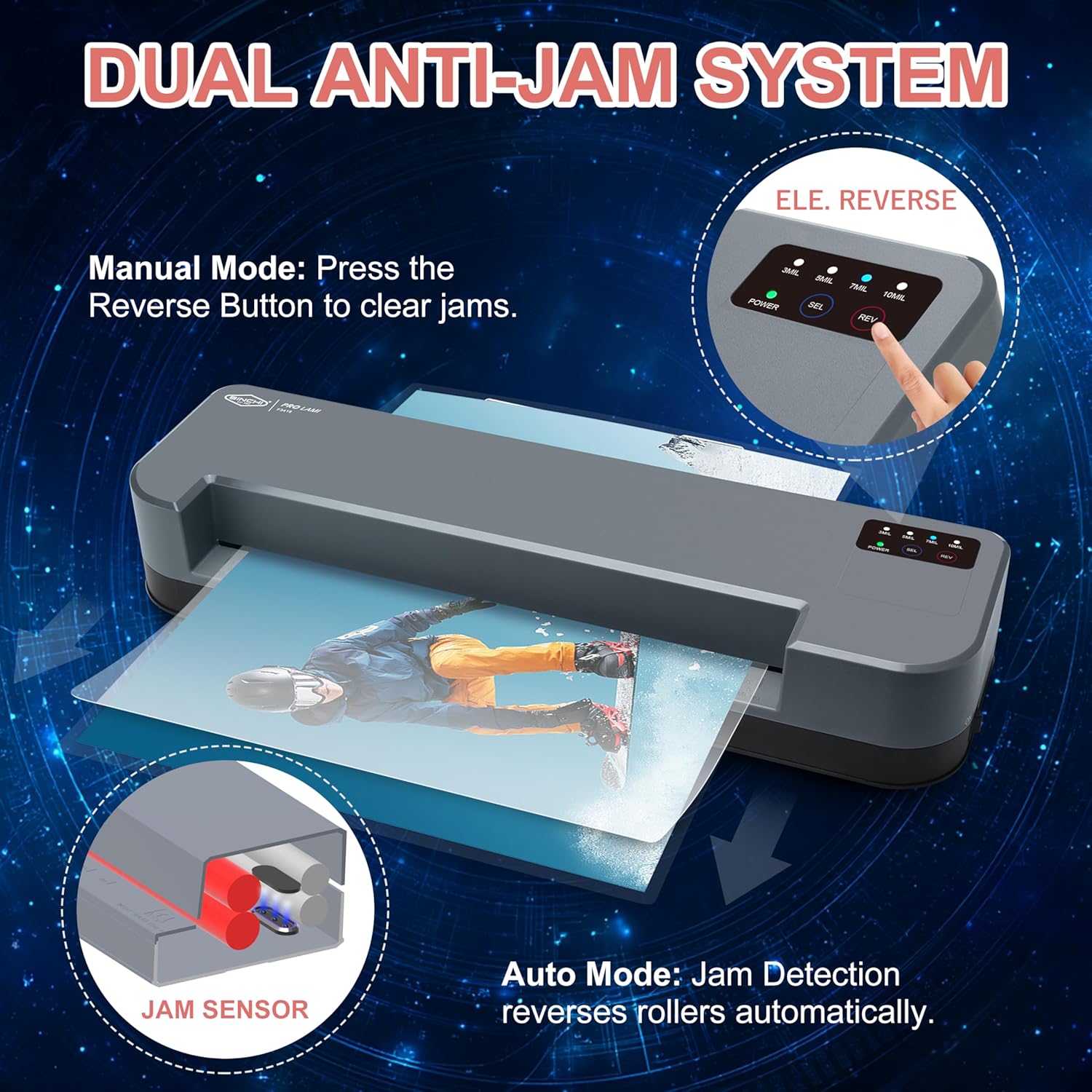 - 【Dual Anti-Jam System】This machine is equiped with both Auto and Manual jam remove syytem. The electrical Reverse Button helps remove jammed sheets easily, the Auto Reverse (Jam Auto Detection) gives an extra protection for anti-jamming. It is idea for office, school, and home.