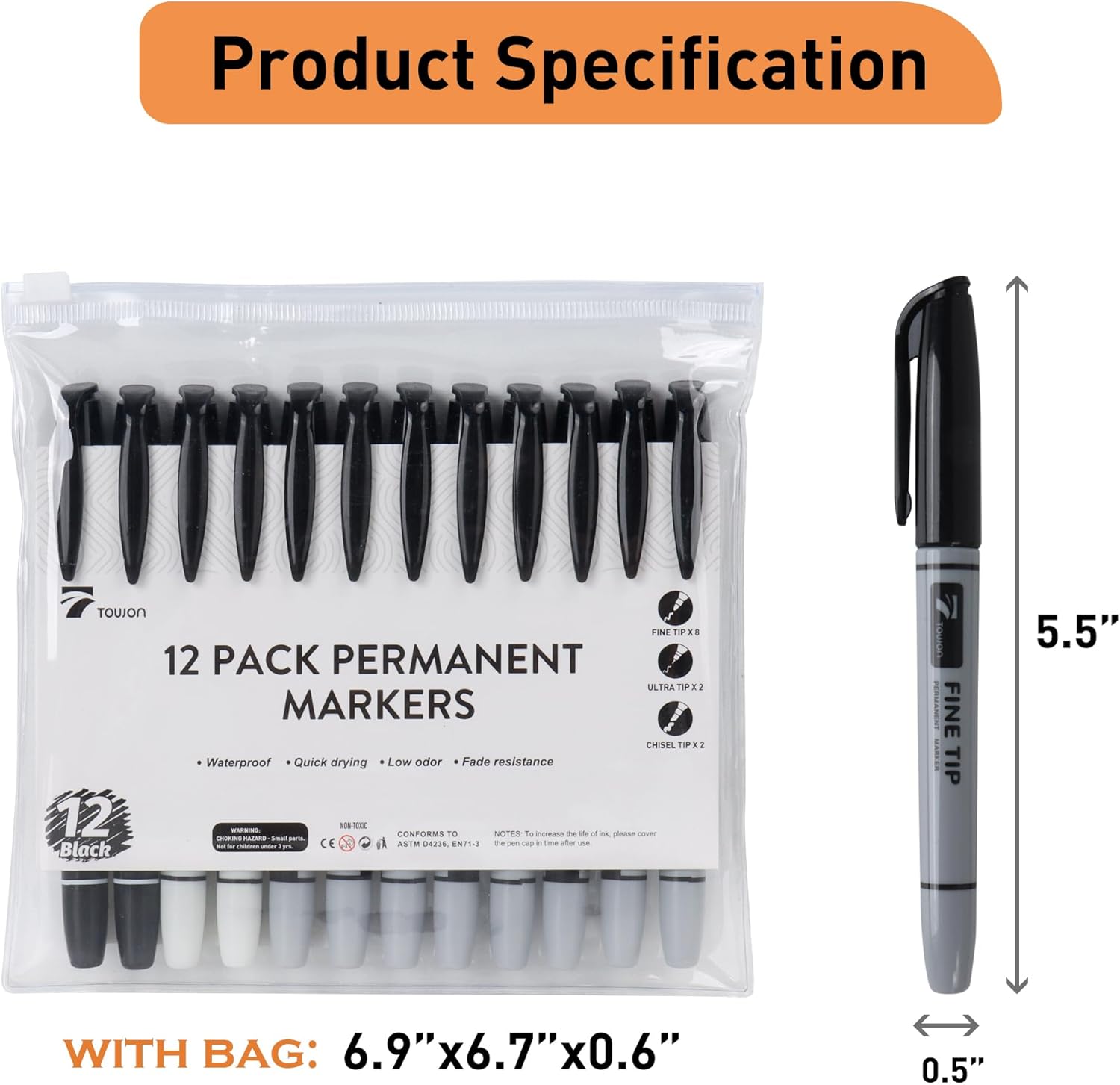 12 Black Permanent Markers with Bag - Waterproof Quick Drying Pens Set 8 Fine Tip, 2 Ultra Fine, 2 Chisel Tip Office Home School Supplies for Adults Writing Doodling Marking