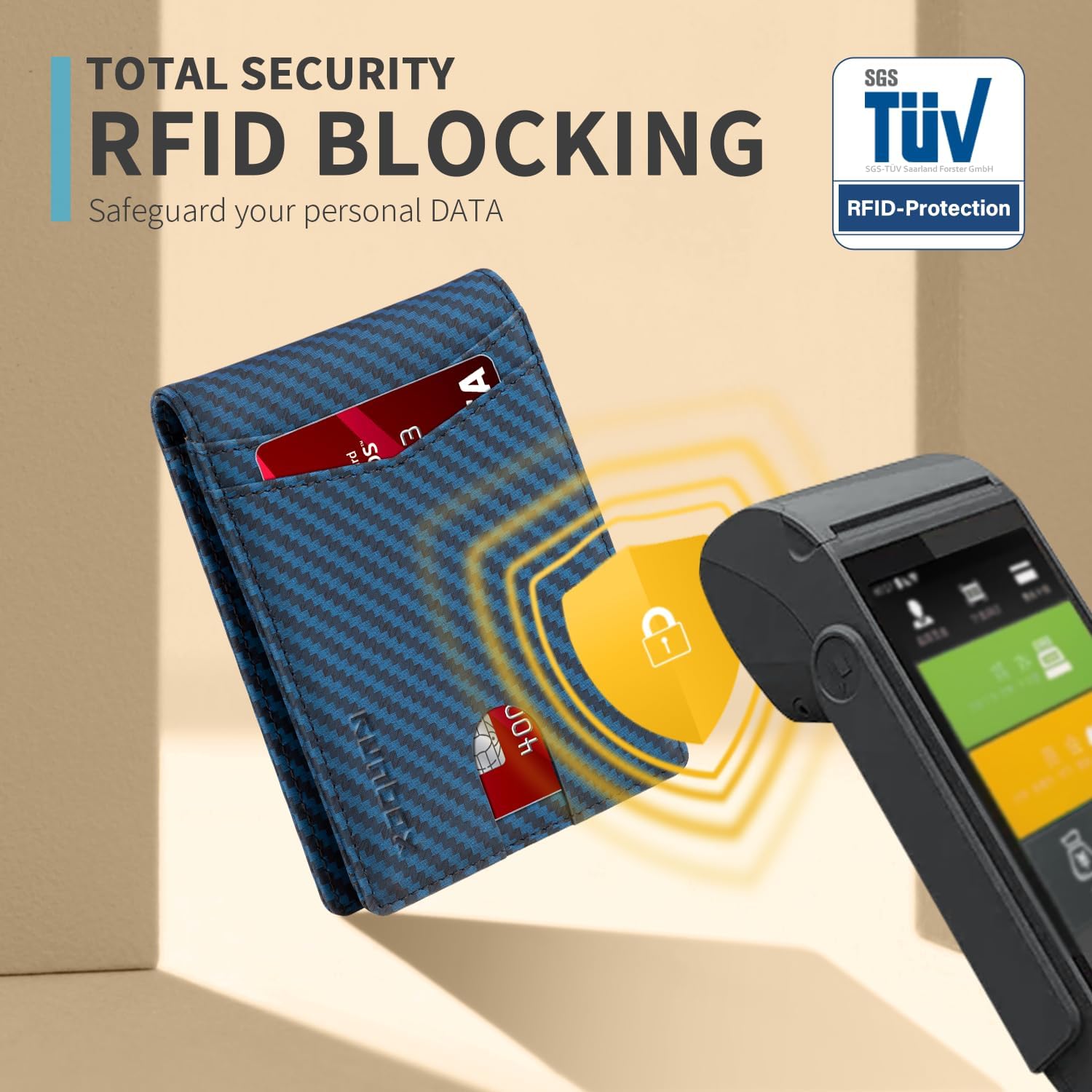 • RFID Blocking - Our wallets are equipped with advanced RFID SECURE Technology, a unique metal composite, engineered specifically to block 13.56 MHz or higher RFID signals and protect the valuable information stored on RFID chips from unauthorized scans. License and ID cards will be protected effectively. Blocking the 13.56 MHz band and protect against data theft by RFID scanners