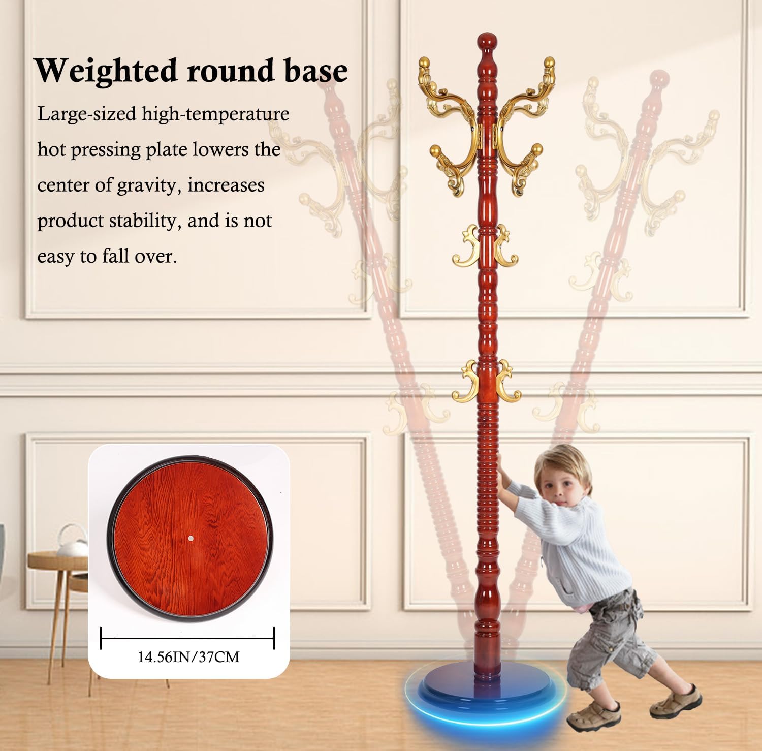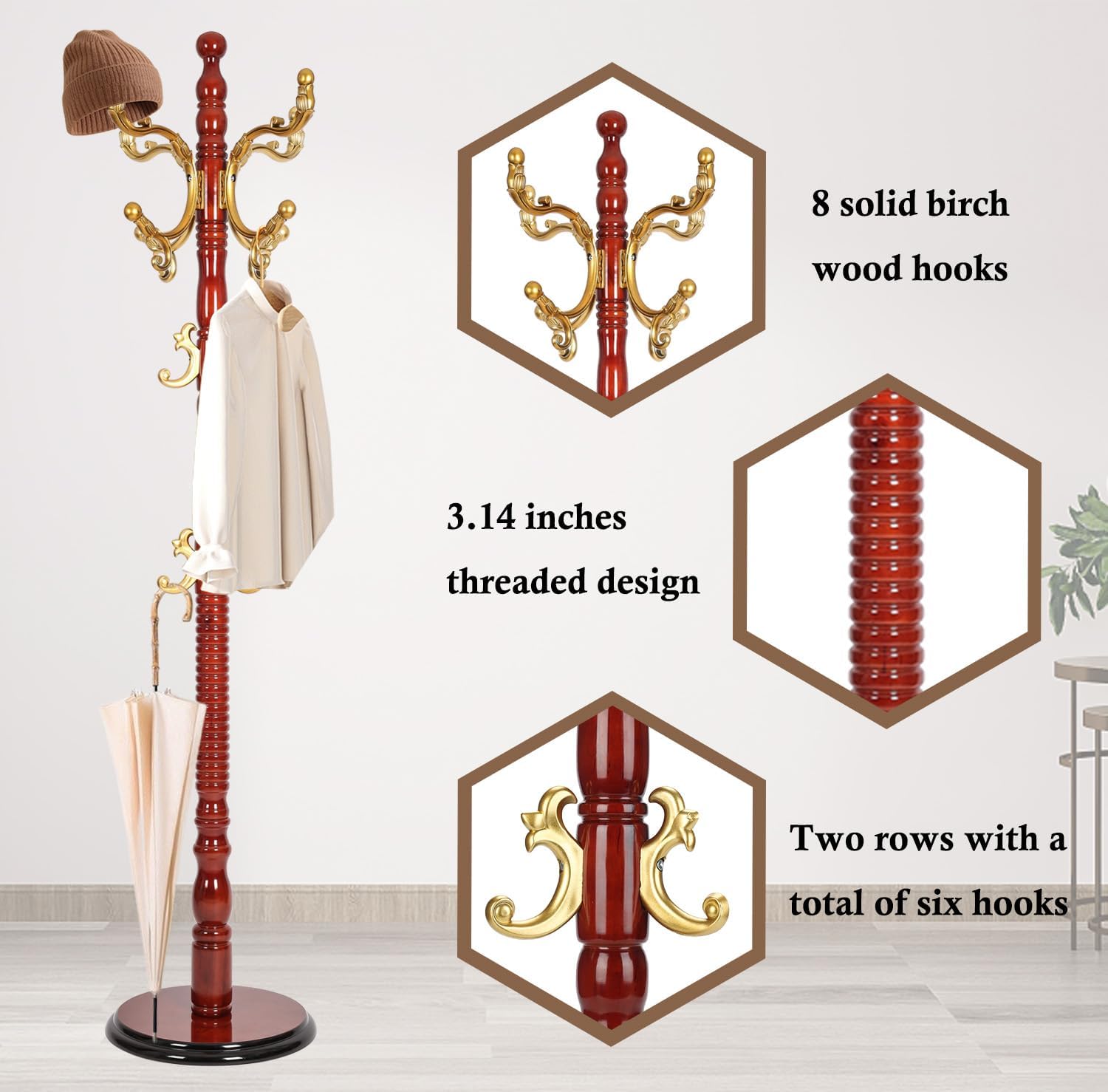 - 【Wider Application】The wooden coat tree is designed in a vintage style, with a simple structure and comprehensive functions. The coat rack can be placed in the hallway, living room, bedroom, office, and any corner you need. The wooden coat tree stand adopts an embedded screw design and is connected to the main pole, and the full-tooth screw is connected to the chassis. Equipped with installation tools and instructions, you can easily complete the installation.
