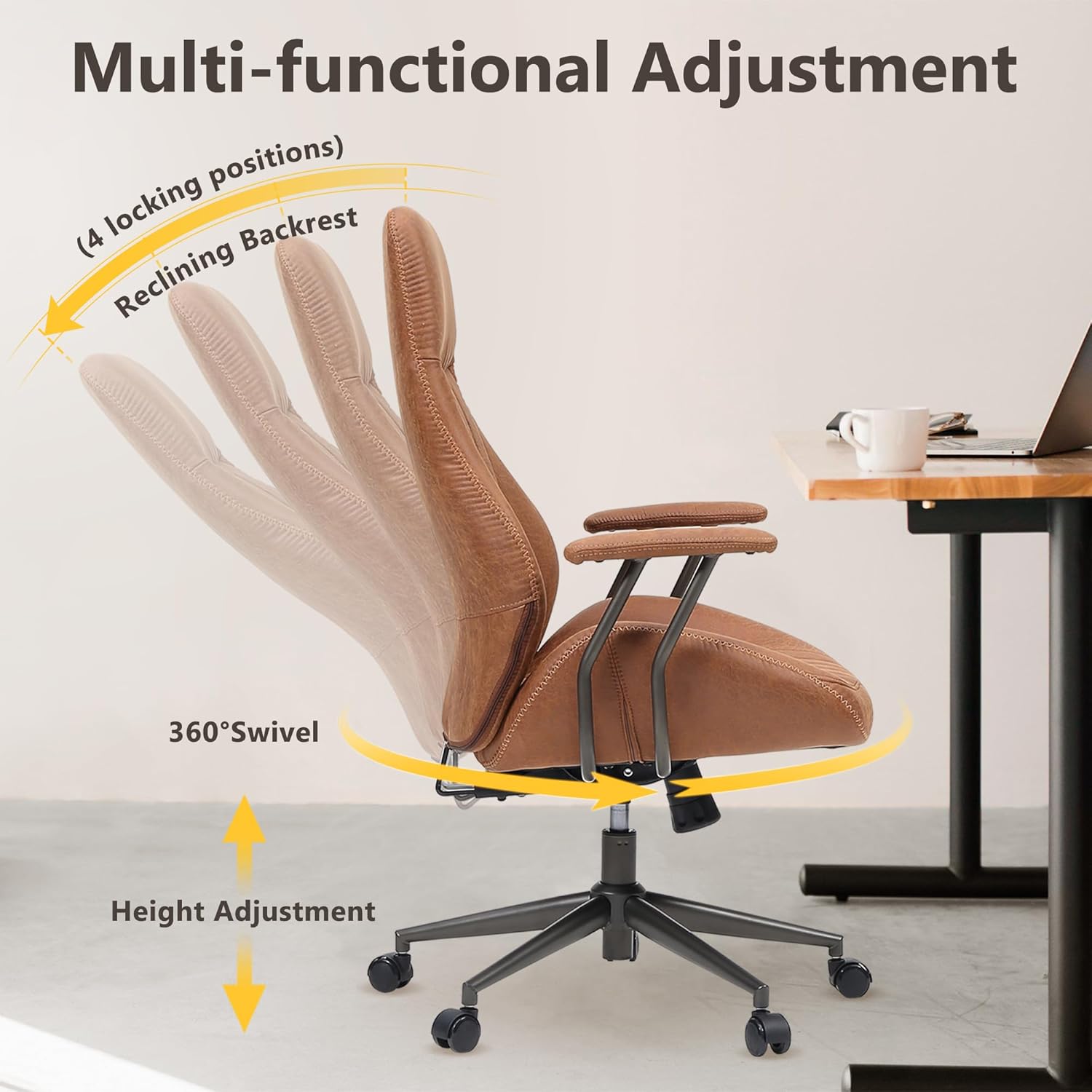 - Flexible Adjustment Features: This desk chair offers remarkable versatility with its array of adjustable functions. Glide effortlessly on its smooth wheels, enjoy a full 360° swivel, and customize your seating with adjustable height and a tilting backrest with a secure lock feature. With a backrest that reclines up to 150° and a height range of 3 inches, it accommodates users of all sizes with ease, allowing you to find your ideal comfort position effortlessl