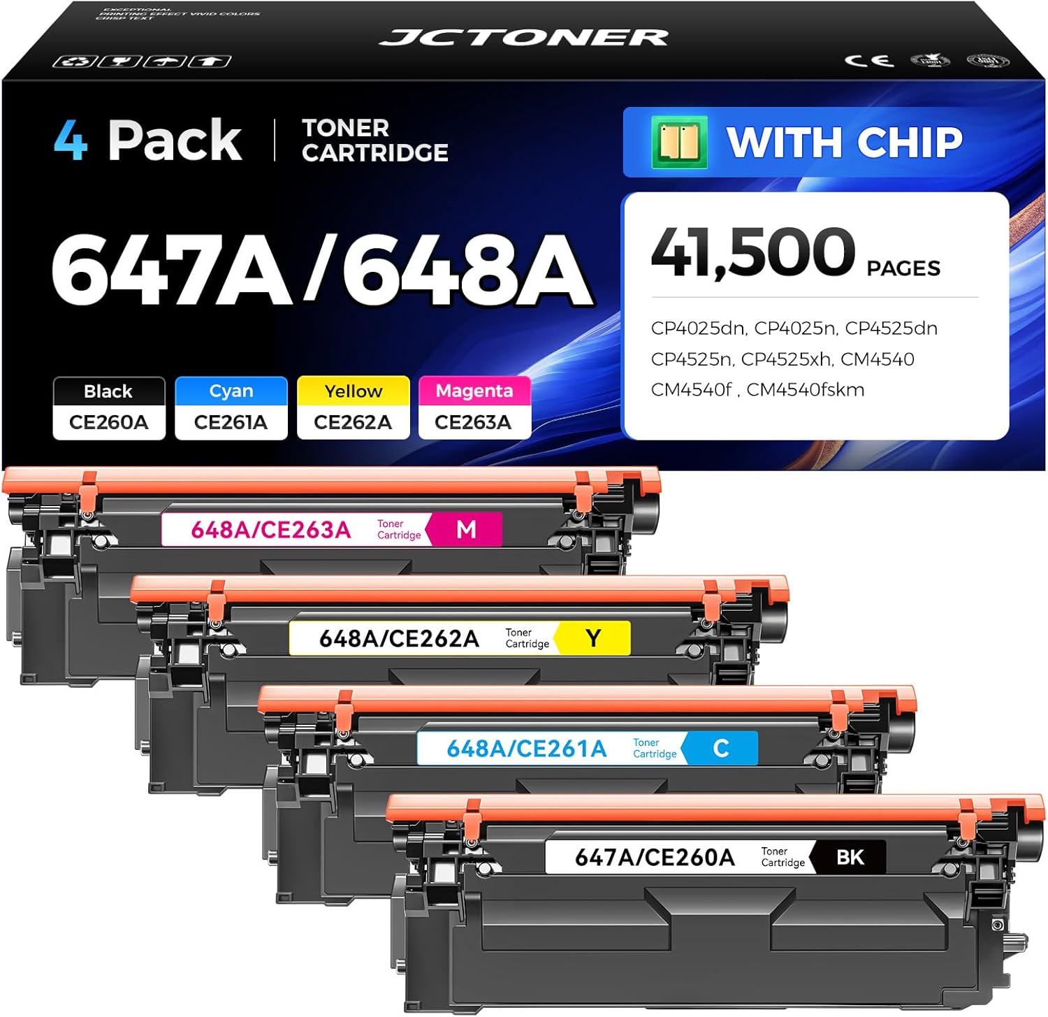 - Compatible with HP 647A(CE260A)Compatible Printer:HP Color LaserJet Enterprise CM4540 MFP, CM4540f MFP, CM4540fskm MFP, Color LaserJet Enterprise CP4025dn, CP4025n, CP4525dn, CP4525n, CP4525xh Series Printer. Compatible with HP 648A(CE261A/CE262A/CE263A)Compatible Printer:Color LaserJet Enterprise CP4025dn, CP4025n, CP4525dn, CP4525n, CP4525xh Series Printer.