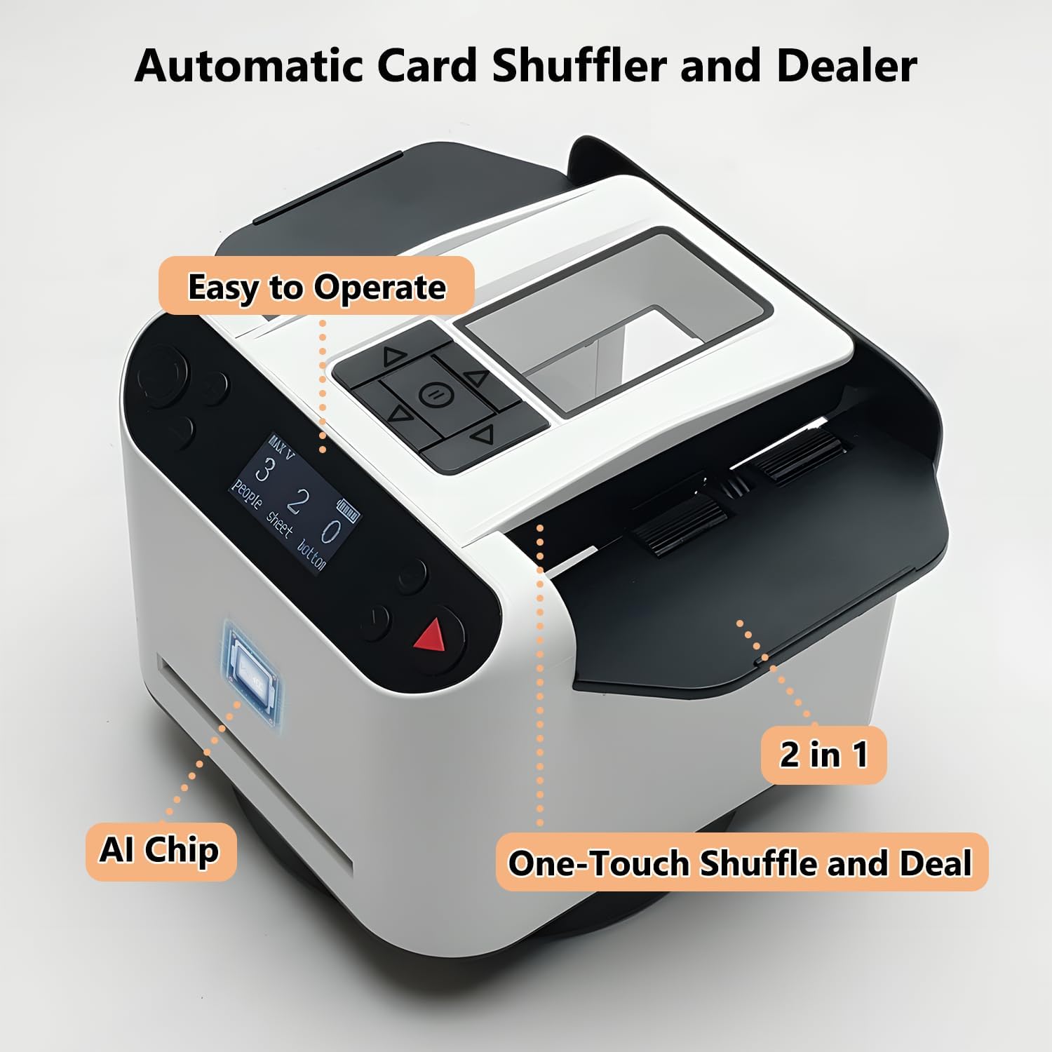 - 2-in-1 Shuffling & Dealing: The Yatics Automatic Shuffler & Dealer innovatively combines shuffling and dealing into one machine, eliminating the hassle of separate shuffling and dealing. Customize automatic dealing after shuffling, player numbers, card count per player, continuous dealing, and choose between clockwise or counterclockwise dealing.