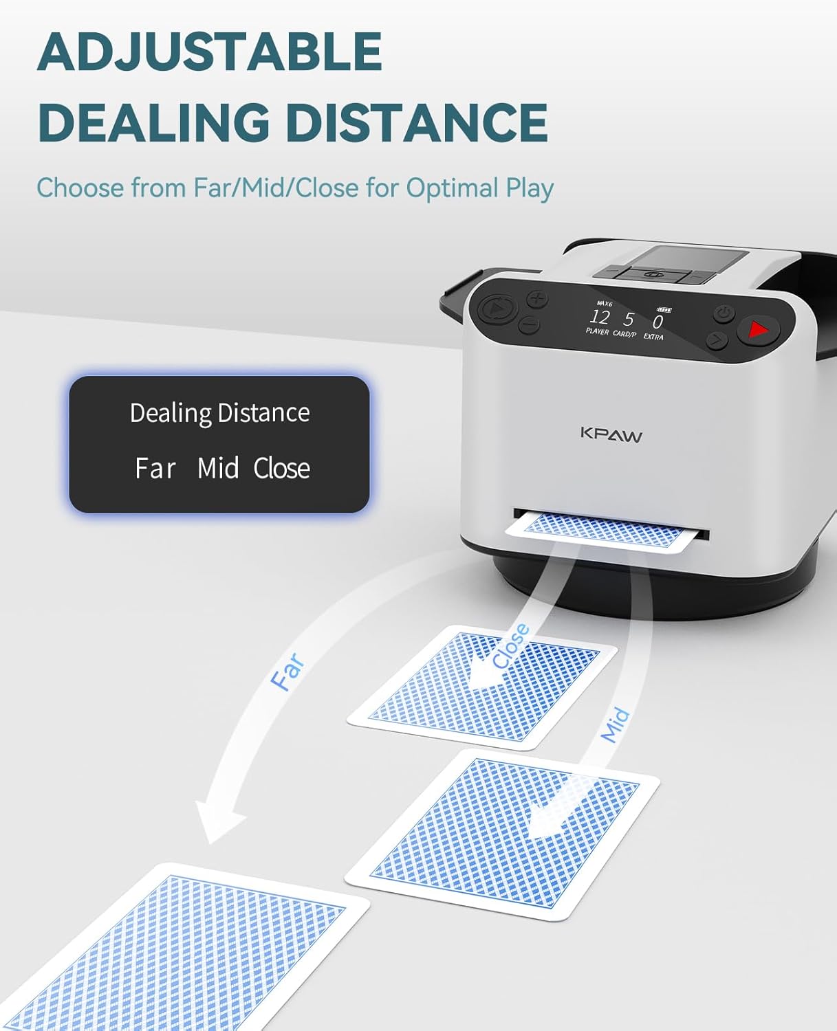 - [FAST & EFFICIENT DEALING] – The high-speed motor can shuffle a deck of cards in as little as 7 seconds. After shuffling, the machine can automatically transition to dealing, ensuring fast-paced, continuous gameplay. Whether you're hosting a poker tournament or casual game night, the KPAW MAX 6 keeps the game flowing