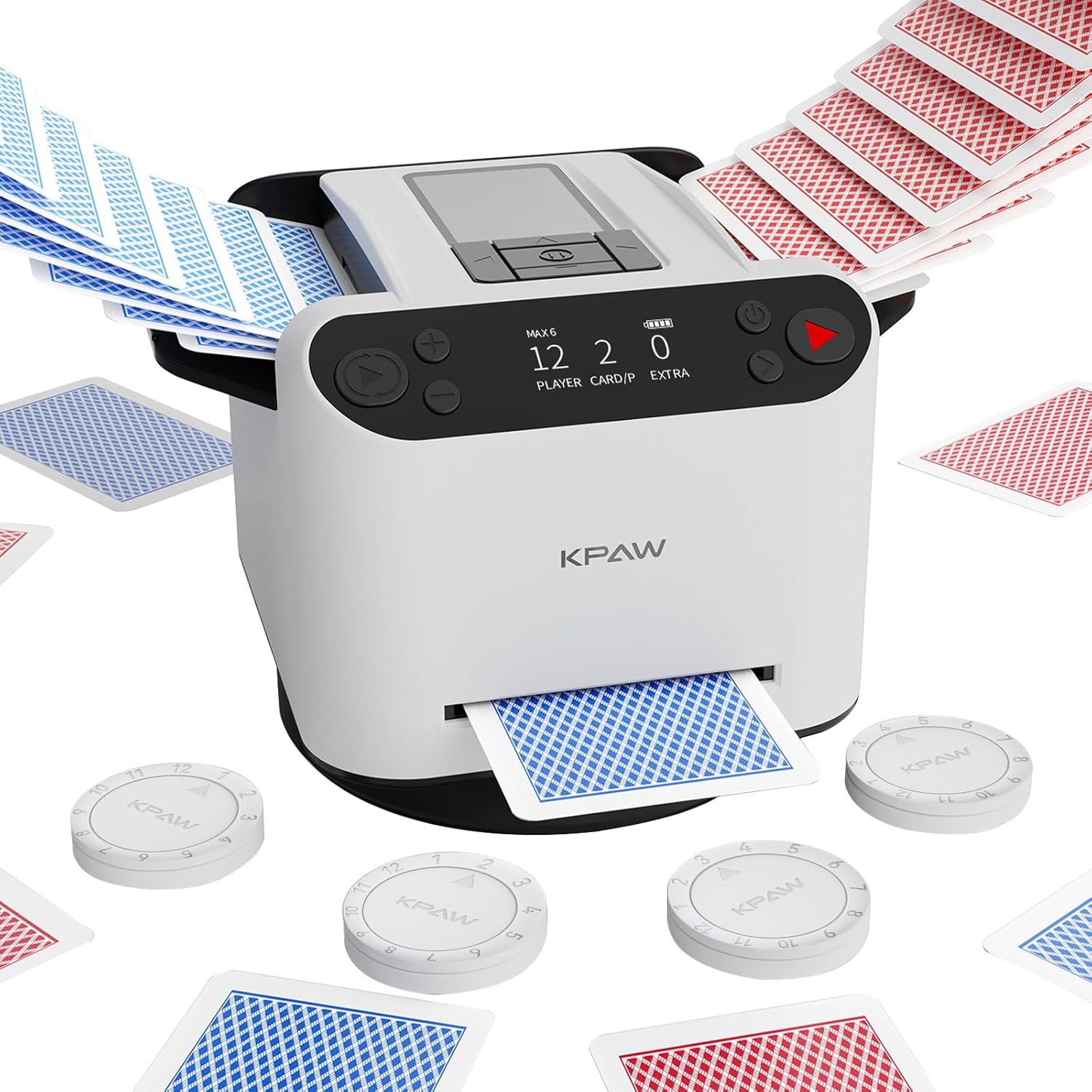 - [2-IN-1 AUTOMATIC CARD SHUFFLER & DEALER]– The KPAW MAX 6 2-i-1 Automatic Card Shuffler & Dealer combines automatic card shuffling and dealing in one machine, making game nights smoother and error-free. With just one single press, the machine automatically shuffles and then deals as you set. Ideal for poker, UNO, Phase 10, Skip-Bo, Five Crowns, etc