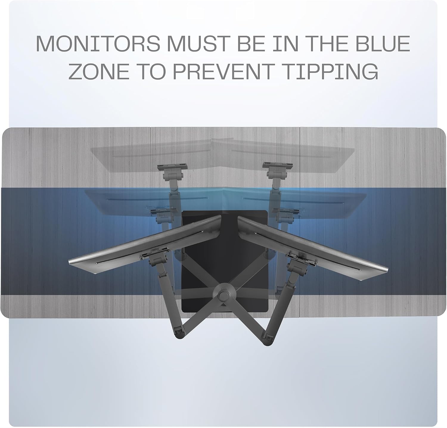 - Screen Configuration Options: Display your monitors stacked with screens centered and extended 5” from the pole, stacked with screens off-centered and up against the pole, or in a side-by-side display