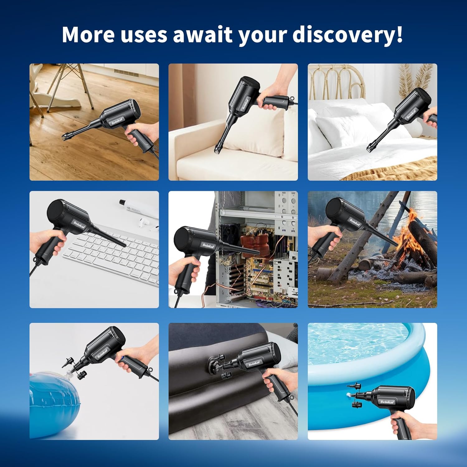 - 【3 types of nozzles】Round nozzles can be used for electronic devices such as laptops, keyboards, and printers. Flat nozzles with up-and-down moving brushes can be used in dusty areas such as PCs. The 3-in-1 nozzle can be used for products such as airbeds and lifeboats that need to be inflated quickly