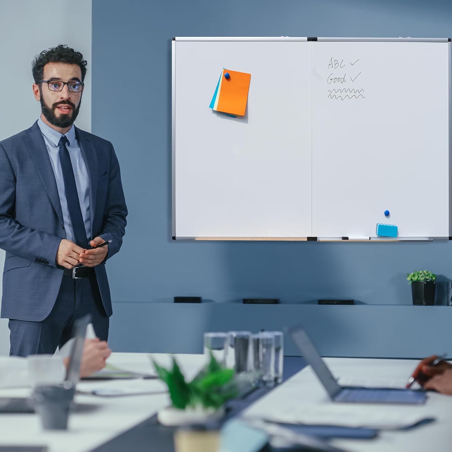 - 【Large White board Dry Erase Board】:The big dry erase whiteboard can be unfolded to a size of 60 x 40 x 0.5 inches,its folded size is only 30 x40 x 1 inches. Middle frame of the foldable double-sided magnetic whiteboard to Prevent Bubble and Bending,Folding design ensures that the large white board will not warp in transit.When not in use, the folding design can save more storage space.