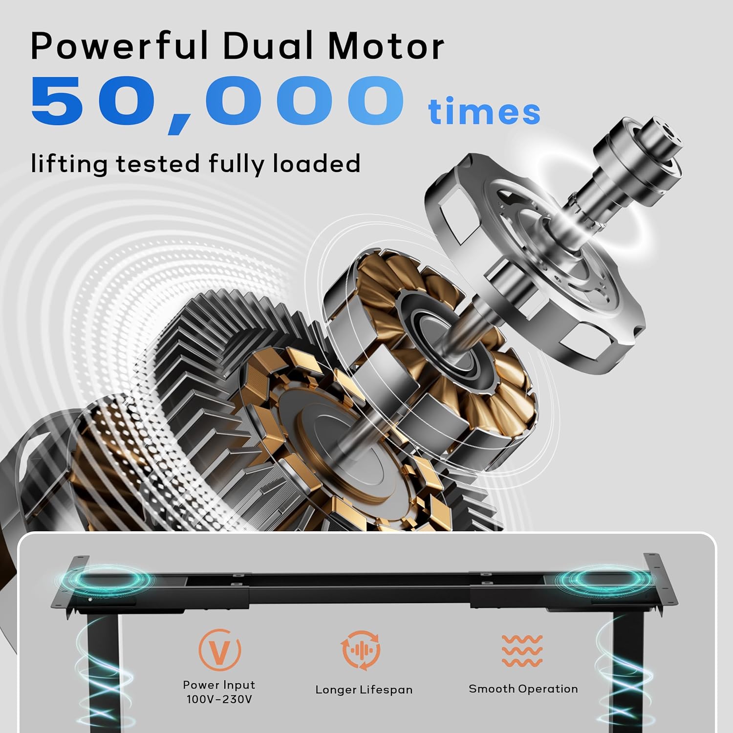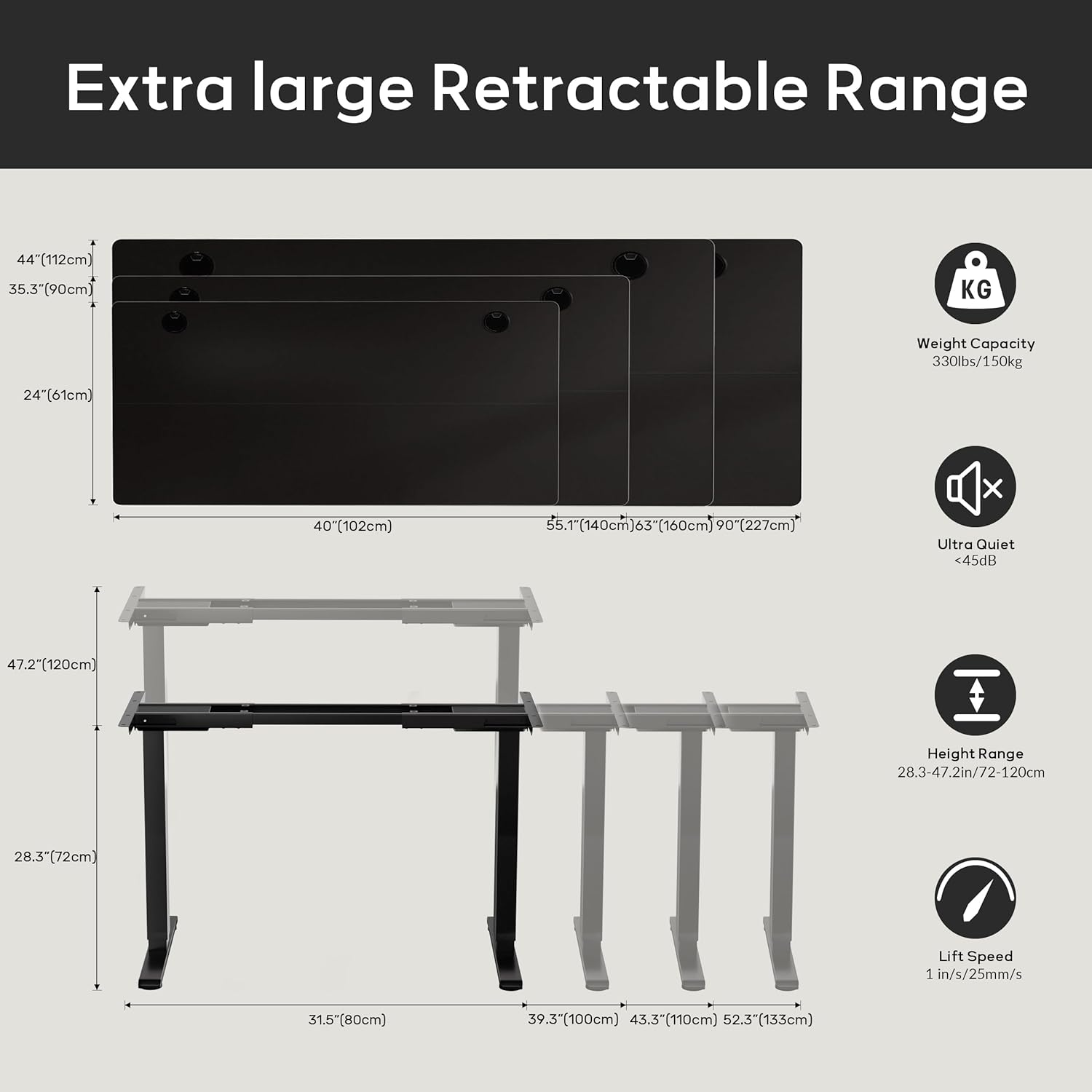 - Desktop Compatibility: Customize your workspace with ease. Our dual motor standing desk legs feature crossbars extending from 31.5" to 52.3", accommodating desktops ranging from 40" to 90" in length and 24" to 44" in depth, supported voltage 100V-240V.