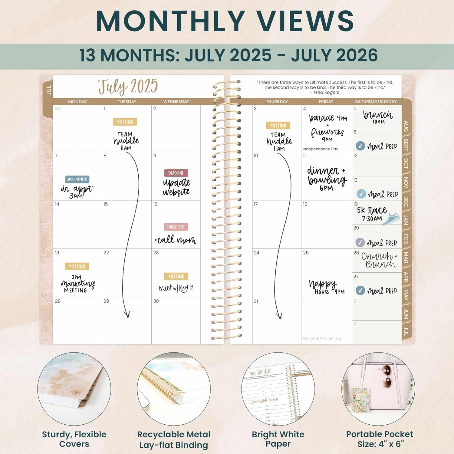 - LAYOUT: 2 page monthly overview spreads and spacious weekly views run academic year, JULY 2025 through JULY 2026 -- 365+ days!