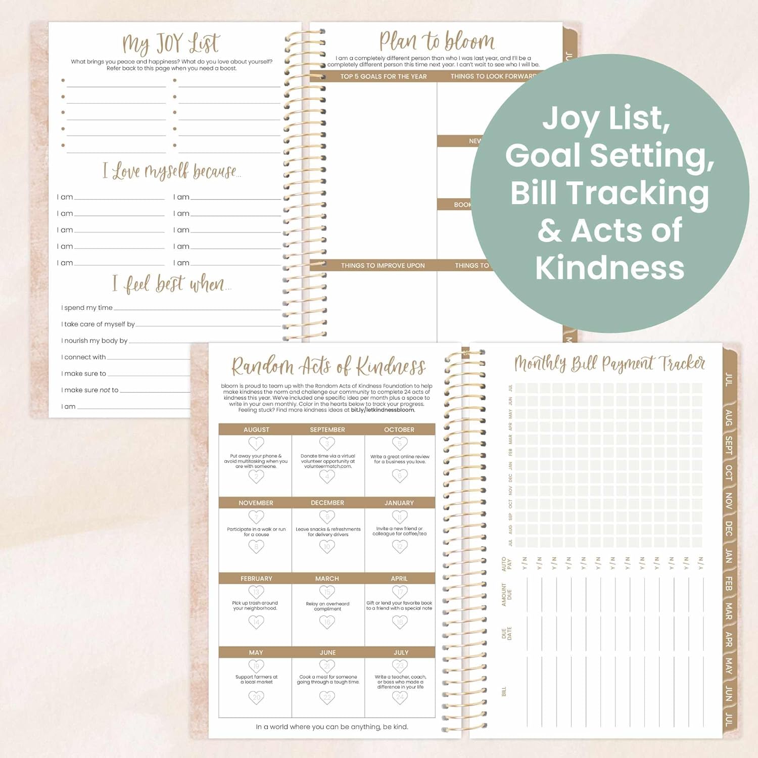 - BONUS: Packed with life coaching worksheets and inspirational features to help you set and achieve all of your goals for the year: yearly overview, values page, monthly bill tracking, joy & affirmations list, 9 notes pages, important dates for next year, monthly quotes & more!