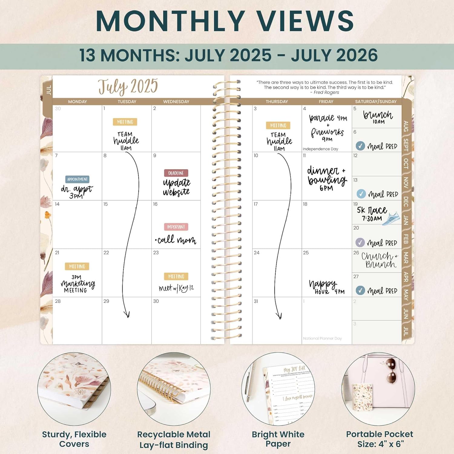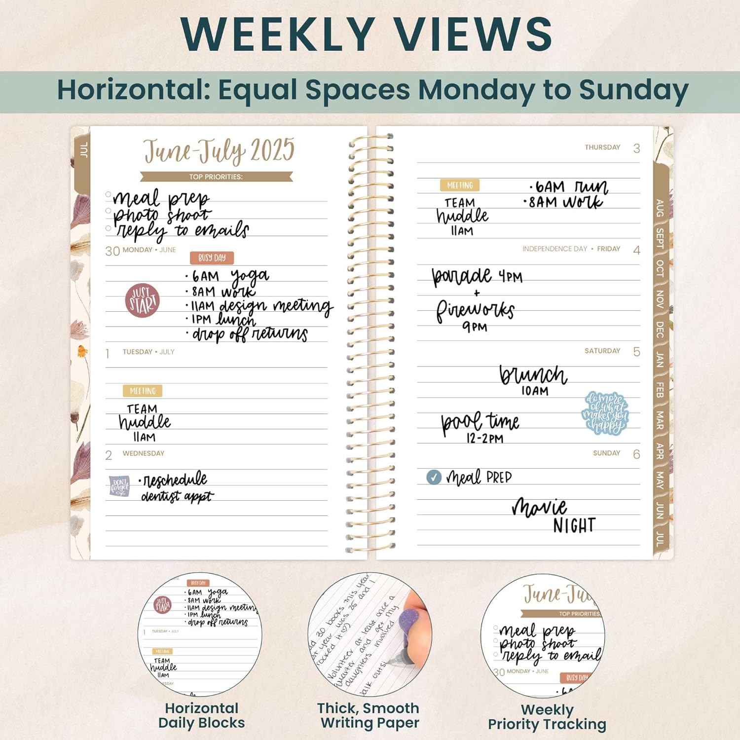 - LAYOUT: 2 page monthly overview spreads and spacious weekly views run academic year, JULY 2025 through JULY 2026 -- 365+ days!