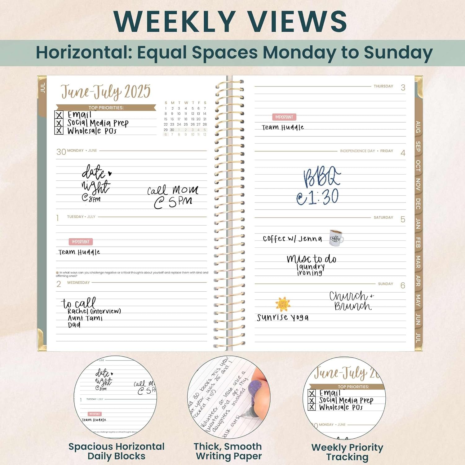 - LAYOUT: 2 page monthly overview spreads and spacious weekly views run academic year, JULY 2025 through JULY 2026 -- 365+ days of planning!