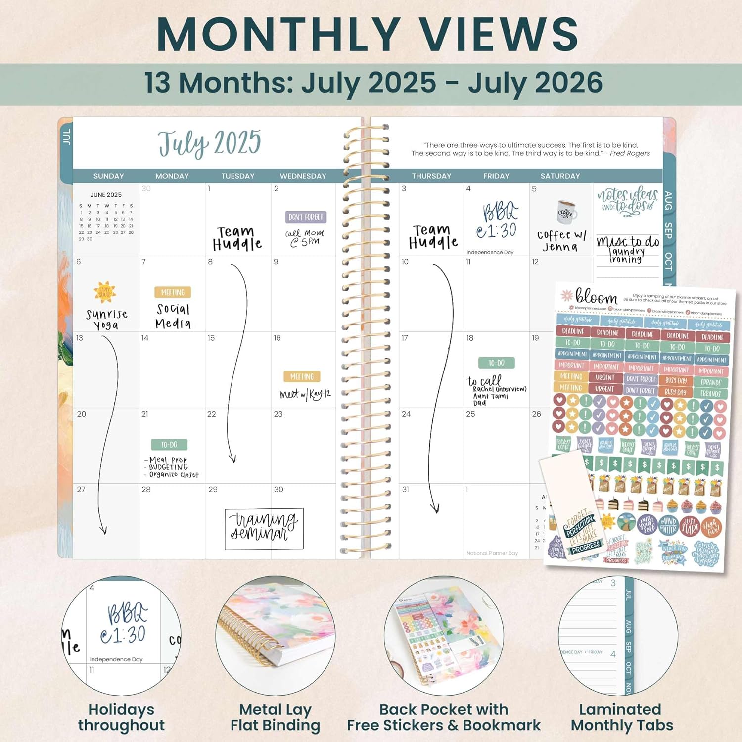 - PREMIUM FEATURES: Soft, lightweight covers made from thick cardstock with gloss film lamination, monthly tabs, deluxe 100gsm bright white bleed-resistant paper, recyclable metal lay-flat spiral binding, front and back inside storage pockets, and a FREE sticker sheet and bookmark!