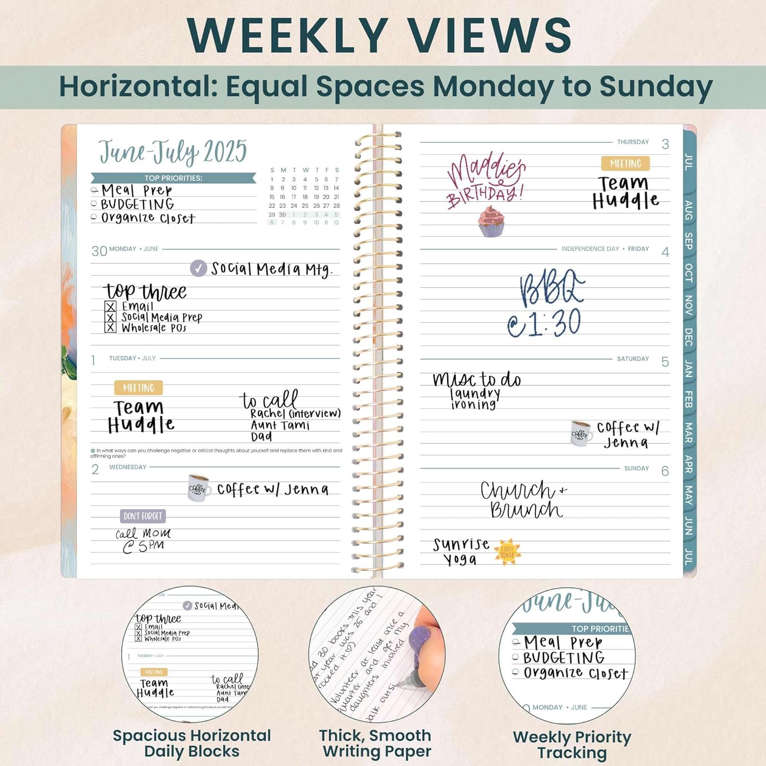 - LAYOUT: 2 page monthly overview spreads and spacious weekly views run academic year, JULY 2025 through JULY 2026 -- 365+ days!
