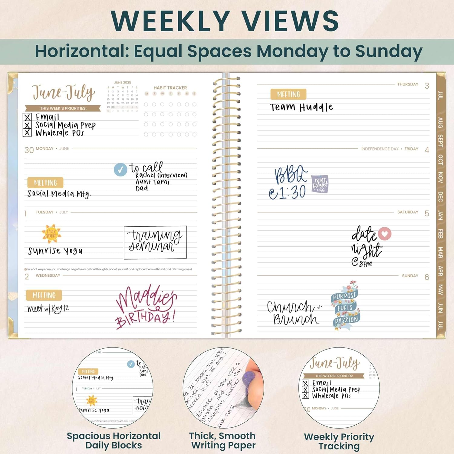 - WEEKLY & MONTHLY PLANNING FOR 2025-2026: Stay organized with two-page monthly calendar spreads and horizontal weekly layouts, covering July 2025 through July 2026. The weekly pages include dedicated sections for priorities & habit tracking, helping you stay focused on tasks, deadlines, and personal growth.