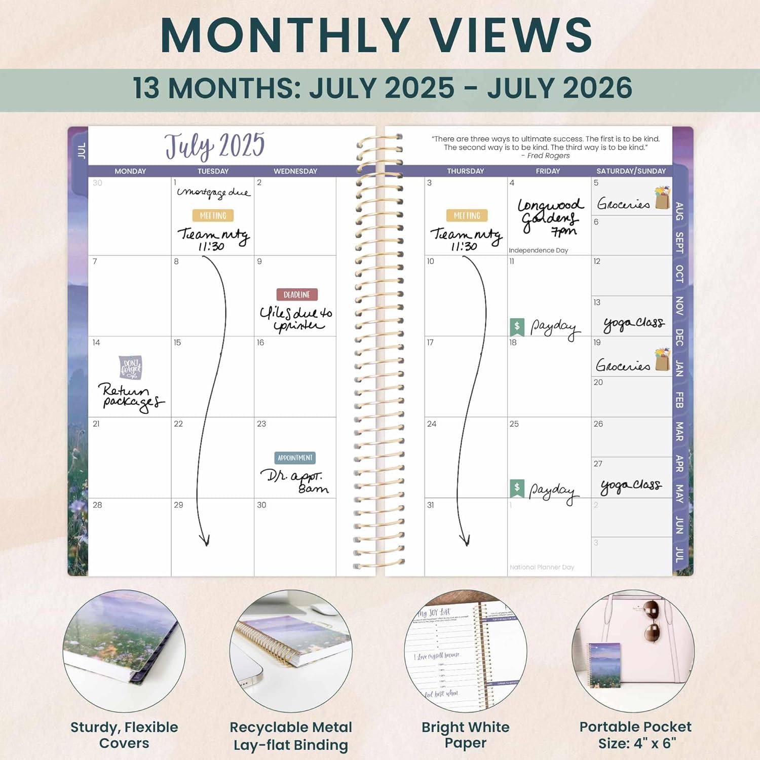 - SMALL 4” x 6” PLANNER WITH WEEKLY & MONTHLY PLANNING: 2 page monthly overview spreads and horizontal weekly views run Academic Year, July 2025 through July 2026. Weekly views are horizontal and include priority tracking.