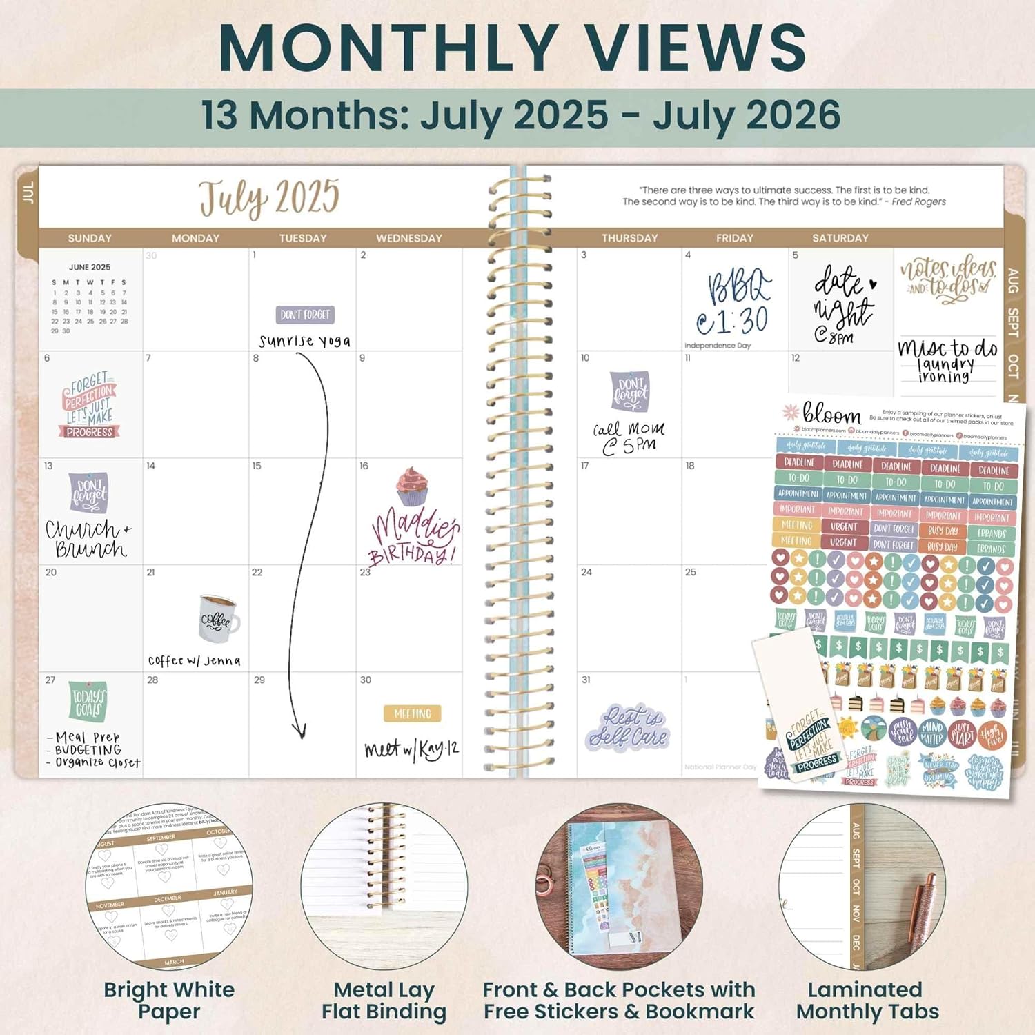 - PREMIUM FEATURES: Soft, lightweight covers made from thick cardstock with gloss film lamination, monthly tabs, deluxe 100gsm bright white bleed-resistant paper, recyclable metal lay-flat spiral binding, vertical front and back inside storage pockets, and FREE magnetic bookmark and stickers now included!