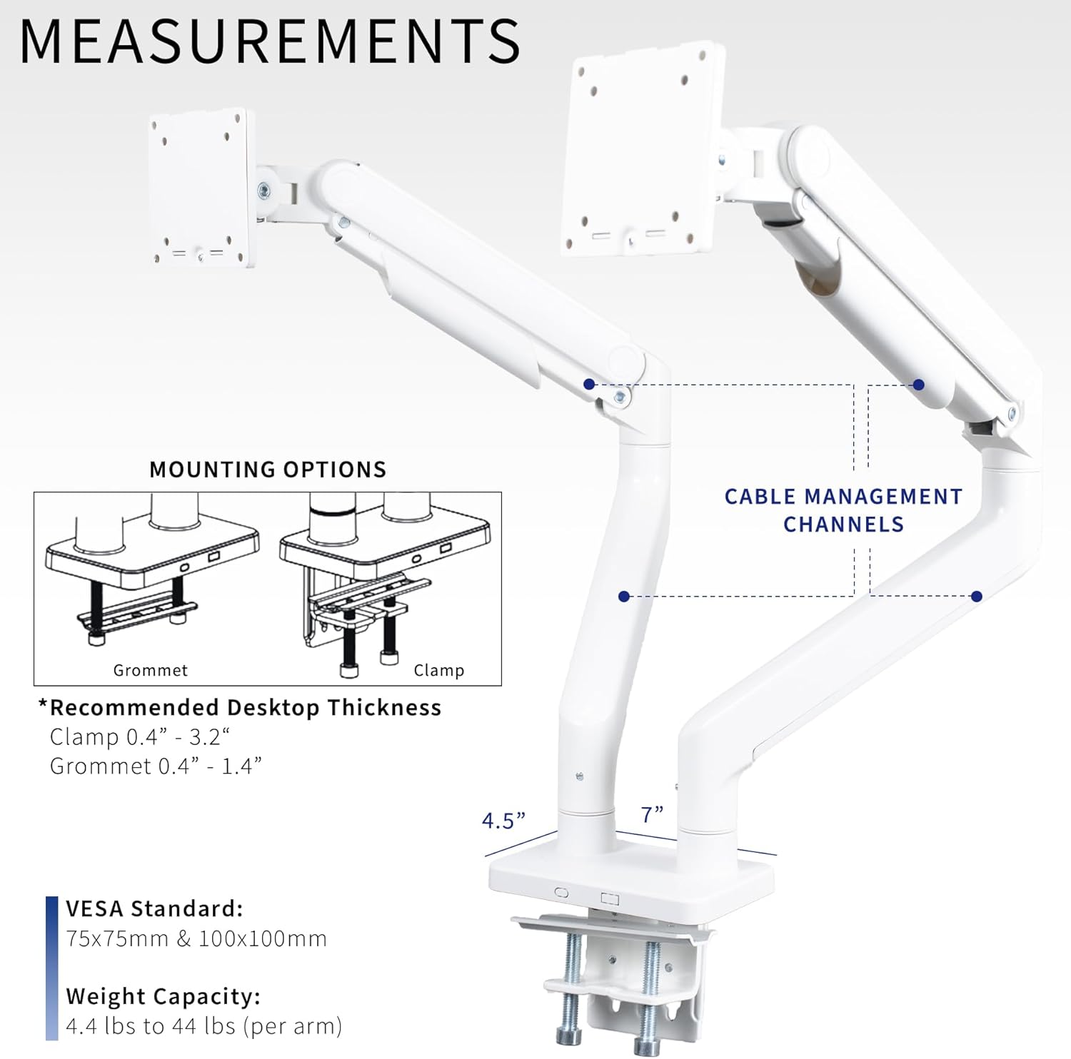 - Fits Ultra Wide Screens: Dual mount for 2 ultra-wide screens up to 45” in size and 44 lbs in weight (per arm) with VESA 75x75mm or 100x100mm. Secures to desks up to 3.2” thick with heavy-duty C-clamp or 1.4” with optional grommet mount