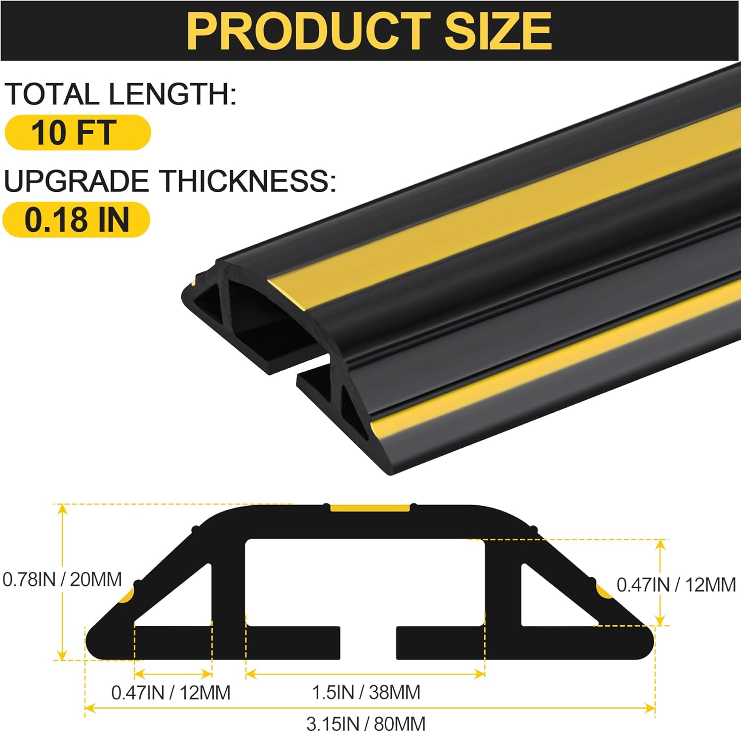 - 【Large Capacity】Floor wire cover for cords has plenty of space, can easily hold up to 5 cables. Wires can be stored in 3 channels without getting tangled. The middle channel measures 1.5 x 0.47 inches, two side channels measure 0.47 x 0.39 inches. Floor cable management is 10 feet long. Please check the size of the cable or wire before purchasing