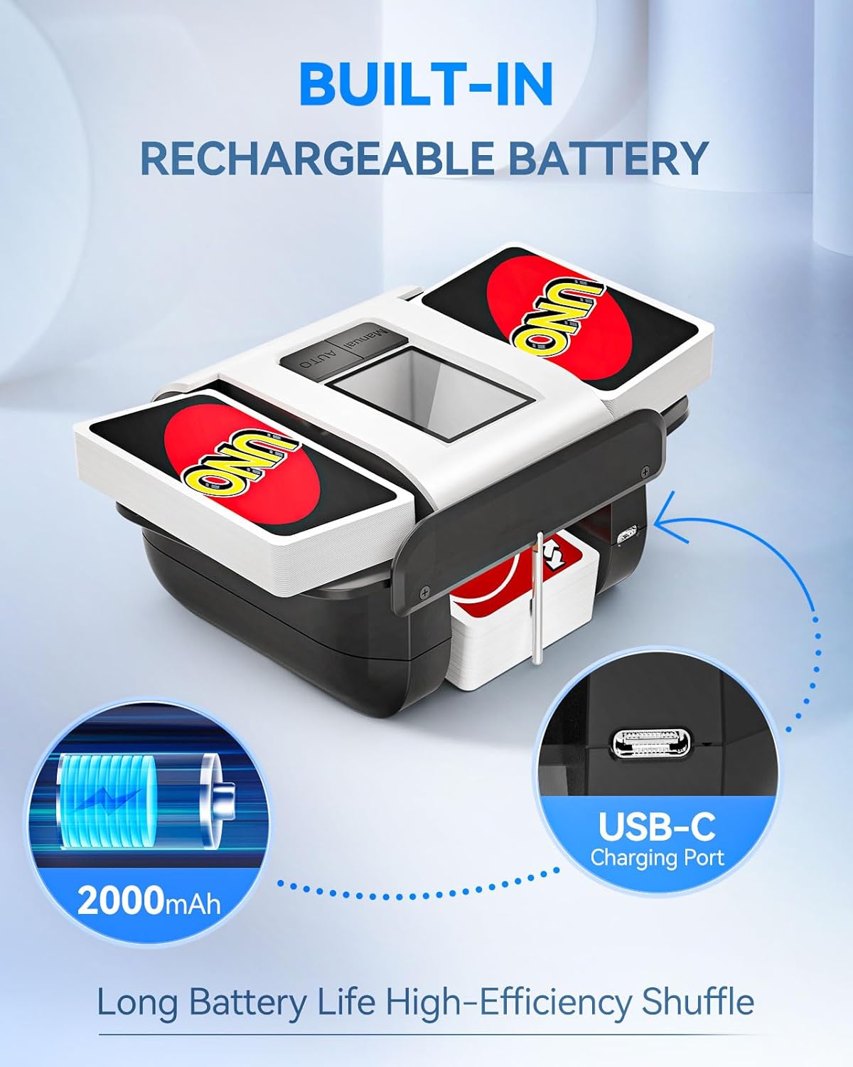 - [HIGH APPLICABILITY] The innovative design makes the KPAW X1 Automatic Card Shuffler Machine highly versatile. The shuffler is suitable for Texas Hold'em, Skip-Bo, Poker, UNO, and Phase 10. The retractable wing allows it to accommodate different card sizes, enhancing its adaptability. Enjoy your card gaming with the KPAW X1 Automatic Card Shuffler Machine.