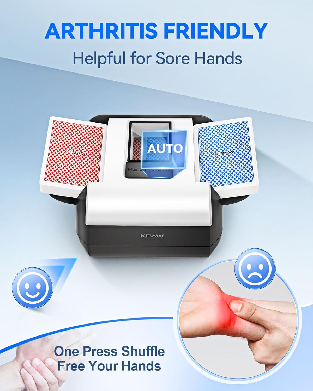 - [ARTHRITIS FRIENDLY] - The KPAW X1 Automatic Card Shuffler Machine is a helpful tool for those with arthritis who enjoy playing poker. The easy operation of this shuffler not only avoids the soreness of the hands of arthritis people but also gives them a better gaming experience.
