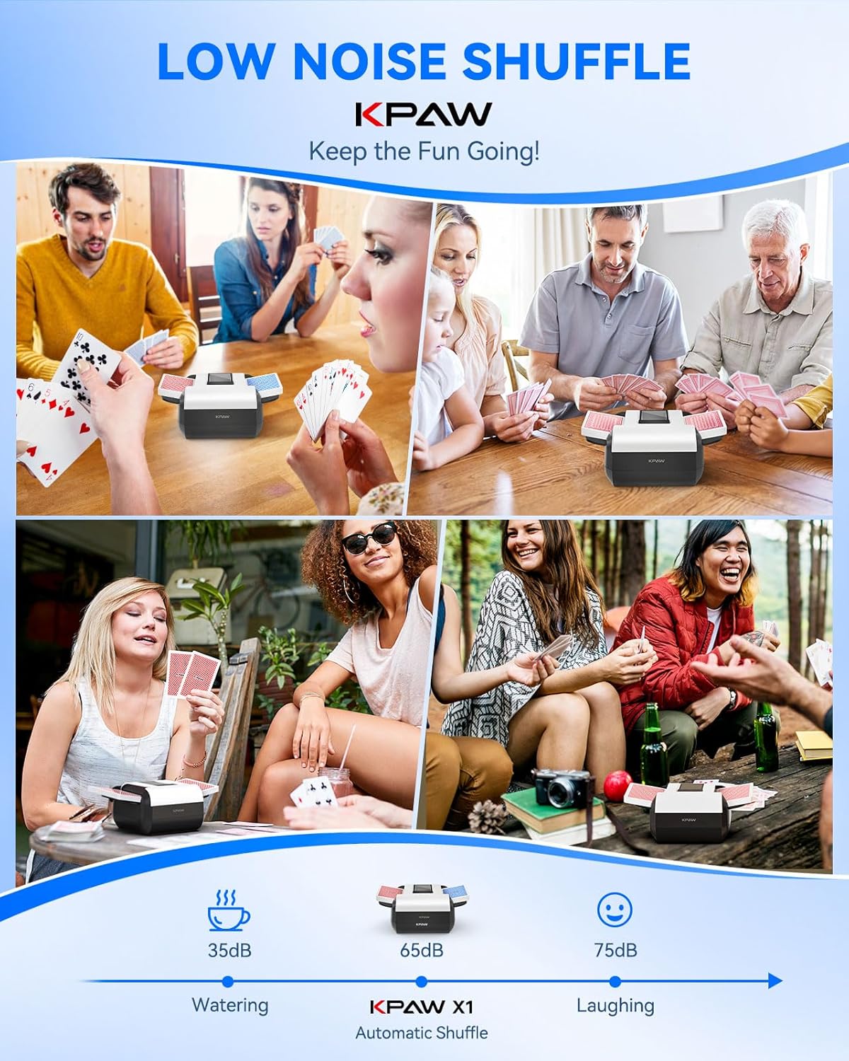 - [LOW NOISE & HIGH QUALITY ] - The KPAW X1 Automatic Card Shuffler Machine stands out from other electric shufflers due to its high-quality materials. It shuffles with lower noise, ensuring a quiet and enjoyable gaming experience. Sturdy and durable, this premium equipment is built to last, providing you with a perfect gaming experience every time.