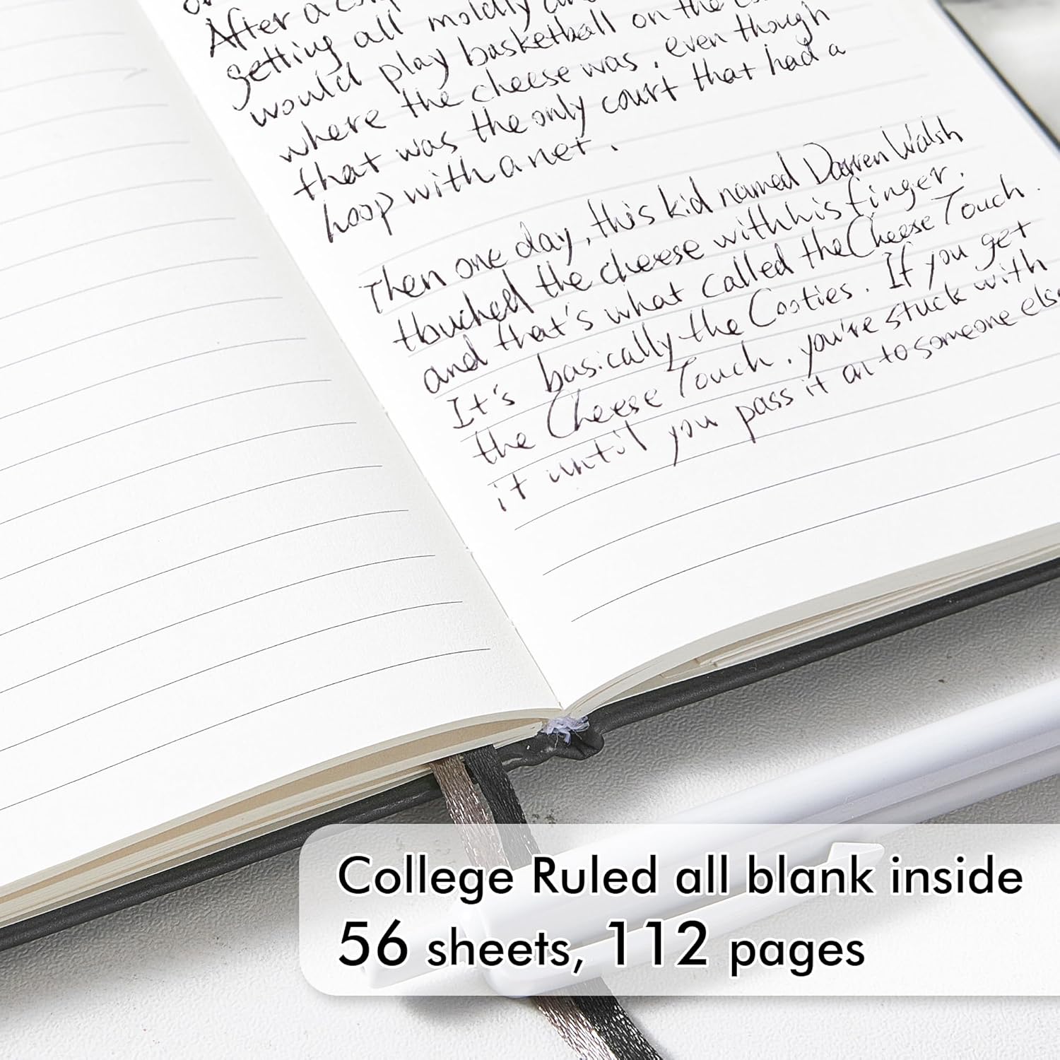 - These college ruled notebooks are all blank inside with 112 lined pages (56 sheets), which would be convenient for daily usage. The hard cover journal has a water-resistant faux leather cover, round corners and bookmarks, which is designed to lay and open flat. There’s a “date/page” column on the top of every page. You can use it as a reminder to let you remember those important dates and find the page you want in a very short time.