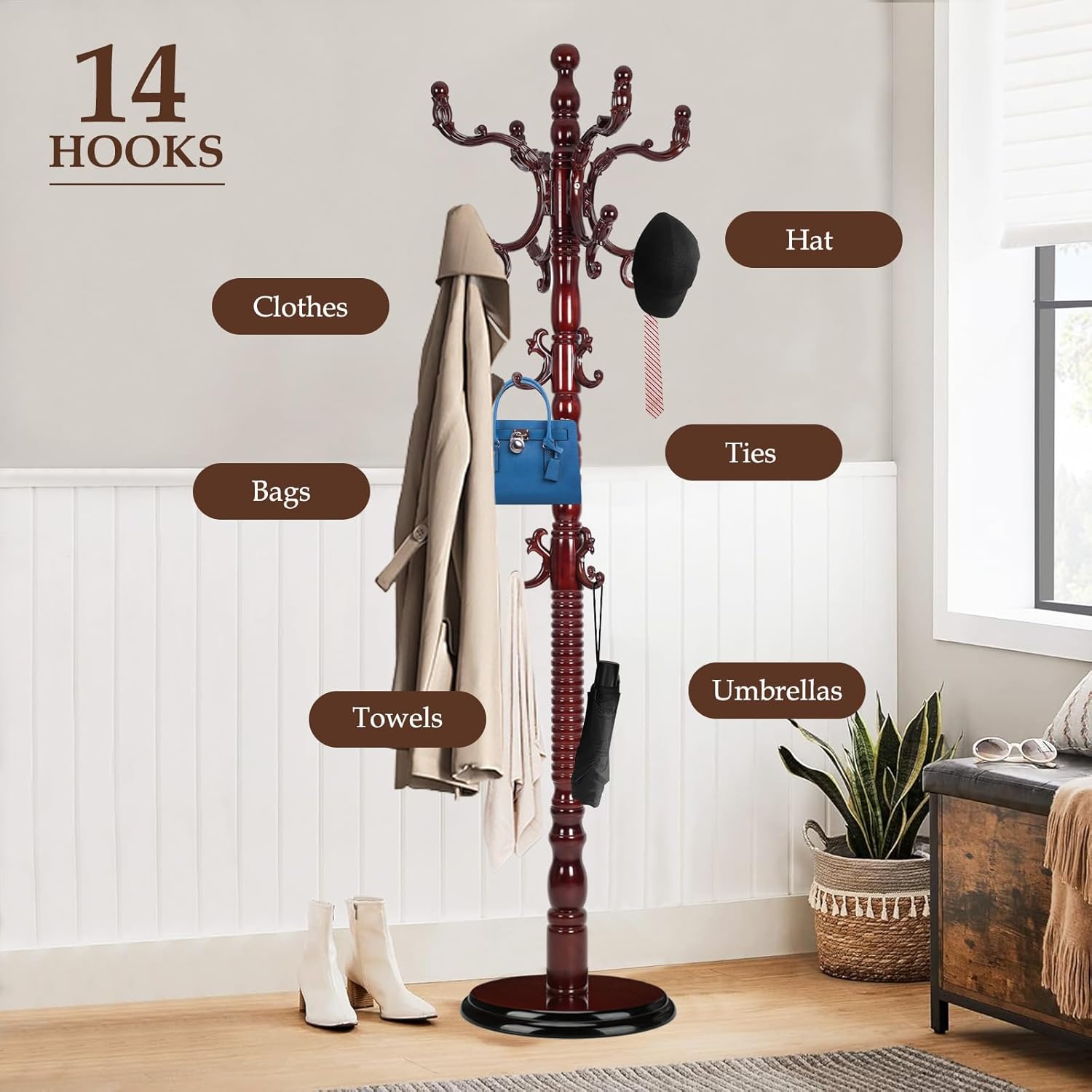 Wood Coat Rack Freestanding, Natural Coats Tree Stand with 14 Hooks, 73" Sturdy and Easy Assembly Coat Rack Stand for Entryway, Hallway, Bedroom, Bags, Hats (Heavy-duty Disc Base, Rosewood)