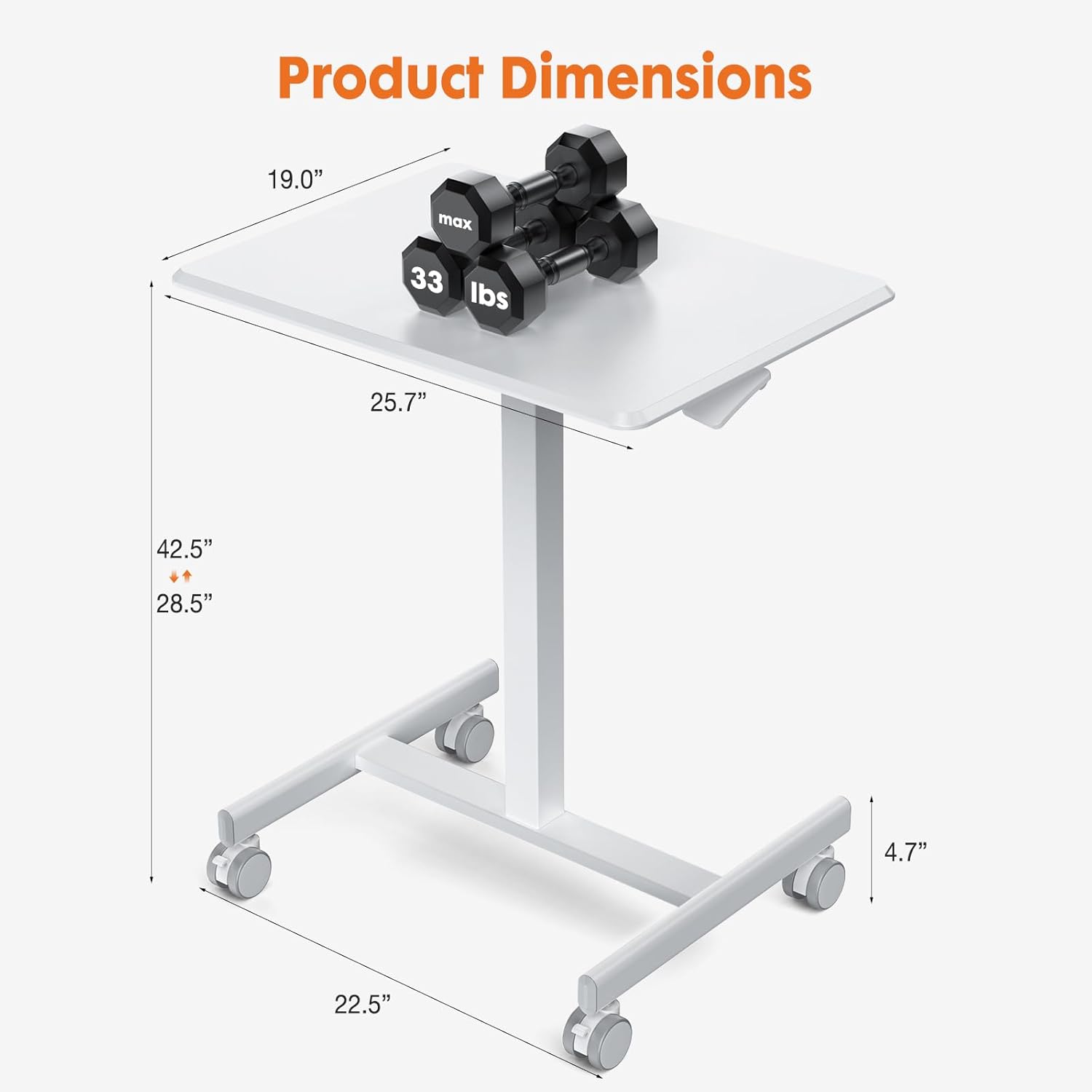 - Height Adjustable: Driven by the powerful gas spring system when you press the handle beside the table, the height of this mobile standing desk with wheels can be changed from 28.5 to 42.5 inches in seconds with fast and smooth lifting, which can be a good solution to help you get rid of long sitting and enjoy health benefits of the small standing desk - with which you can stretch out your legs, better focus while working, reduce your back pain and lose the weight