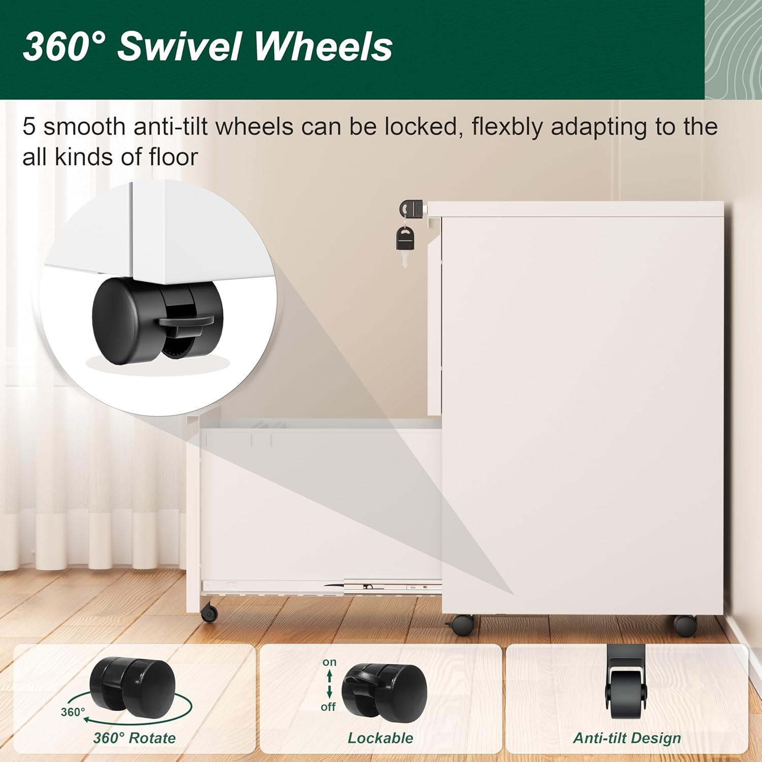 - ❤Mobile File Cabinet -- This mobile filing cabinet is equipped with five rubber wheels, so you don't have to worry about the wheels scratching the floor. In particular, the front central caster to prevent tipping over. And four of the wheels can rotate 360 degrees for stability.
