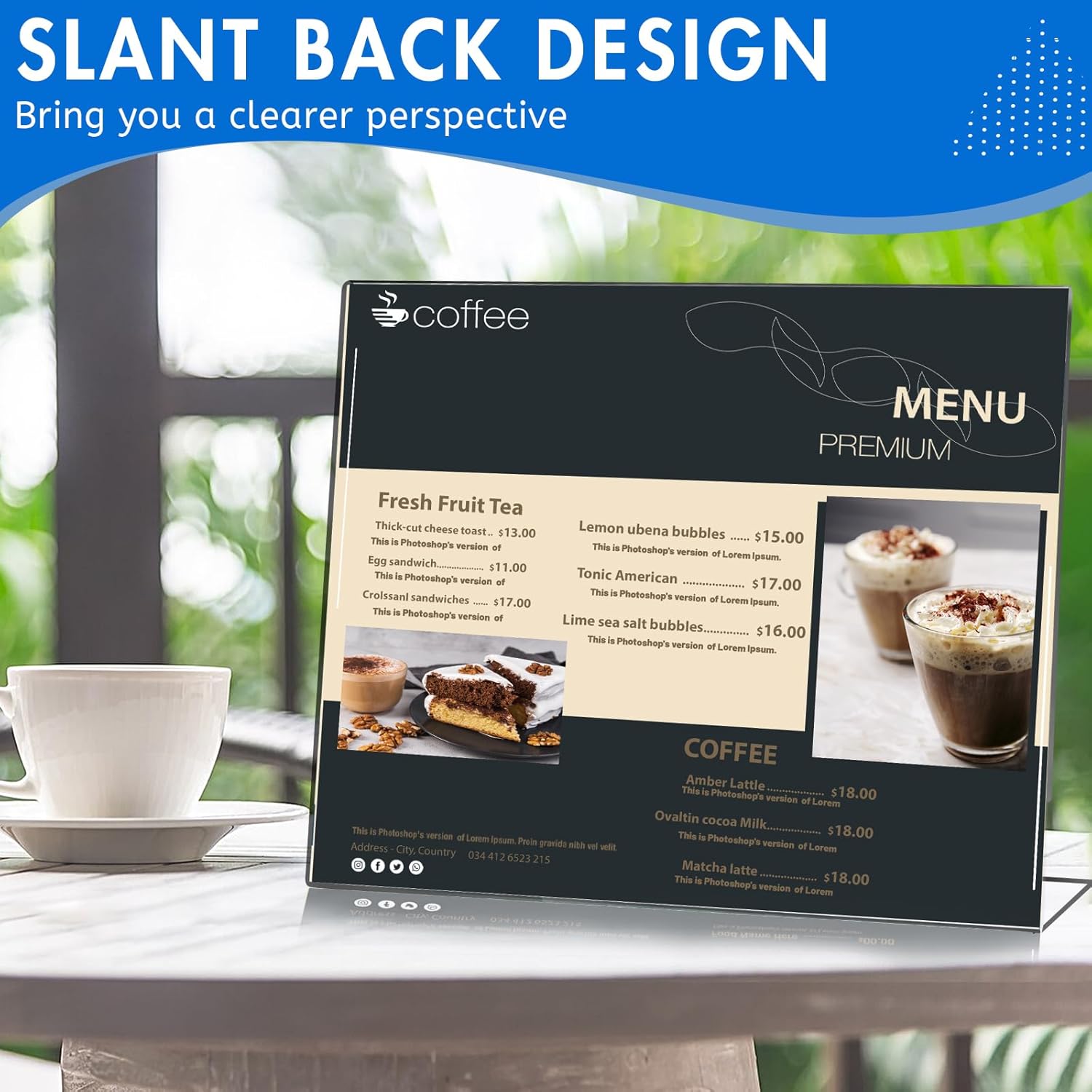 - Slant Back Design: The acrylic sign holders are designed with a slant back and tilts at a perfect angle to display the information on the paper, whether it's a guideline message or a dish. The bottom of the 8.5x11 acrylic sign holder is supported by an anti-tilt base for stability. Note: In order to ensure that you receive the most perfect plastic table sign holders, we have attached a protective film on the surface of each acrylic stand, please remove the film before use