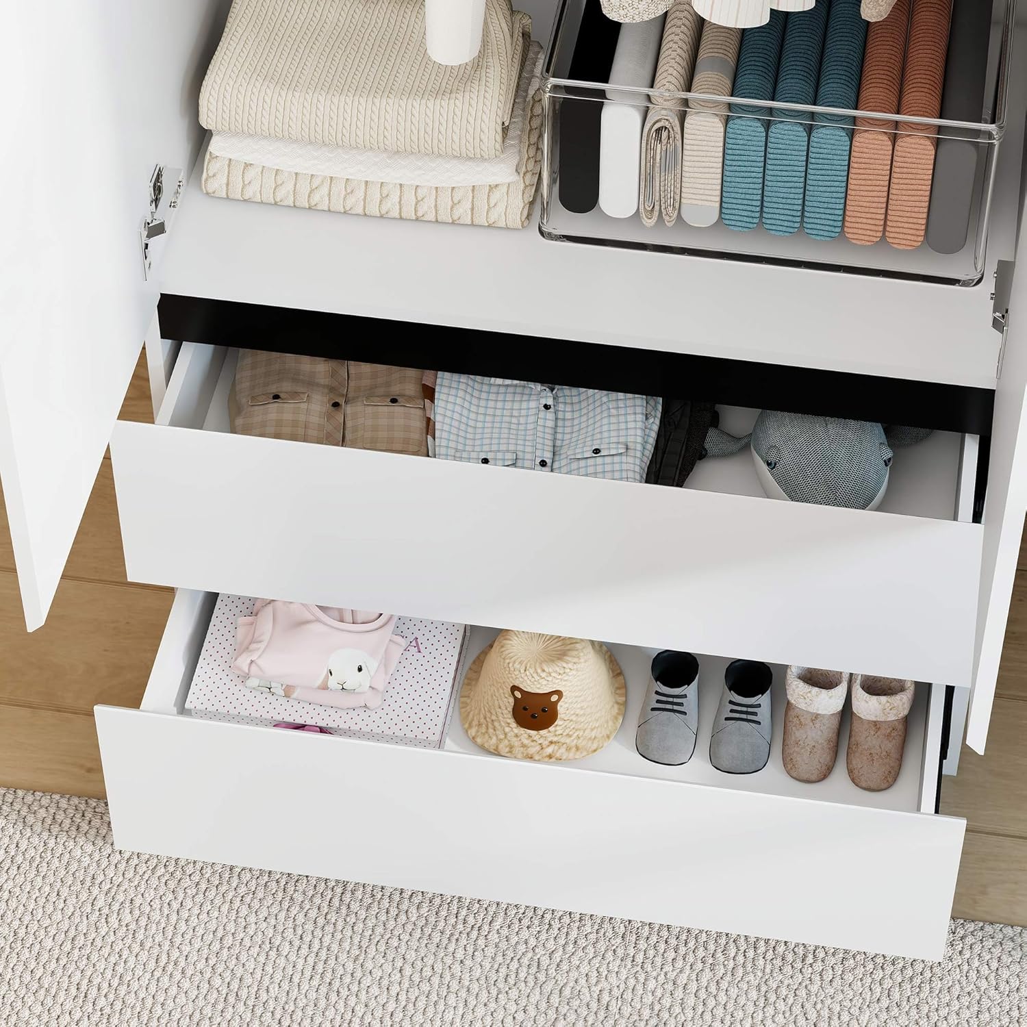 - Durable materials, easy to clean and maintain:Made from high-quality engineered wood, the surface of the white wardrobe closet with drawers is specially treated for exceptional scratch resistance and waterproof performance. During daily use, the surface of the white closet resists scratches and stains, and can be easily wiped clean. The sturdy structure design not only enhances the durability of the wooden wardrobe closet with doors but also ensures stability and safety during long-term use.
