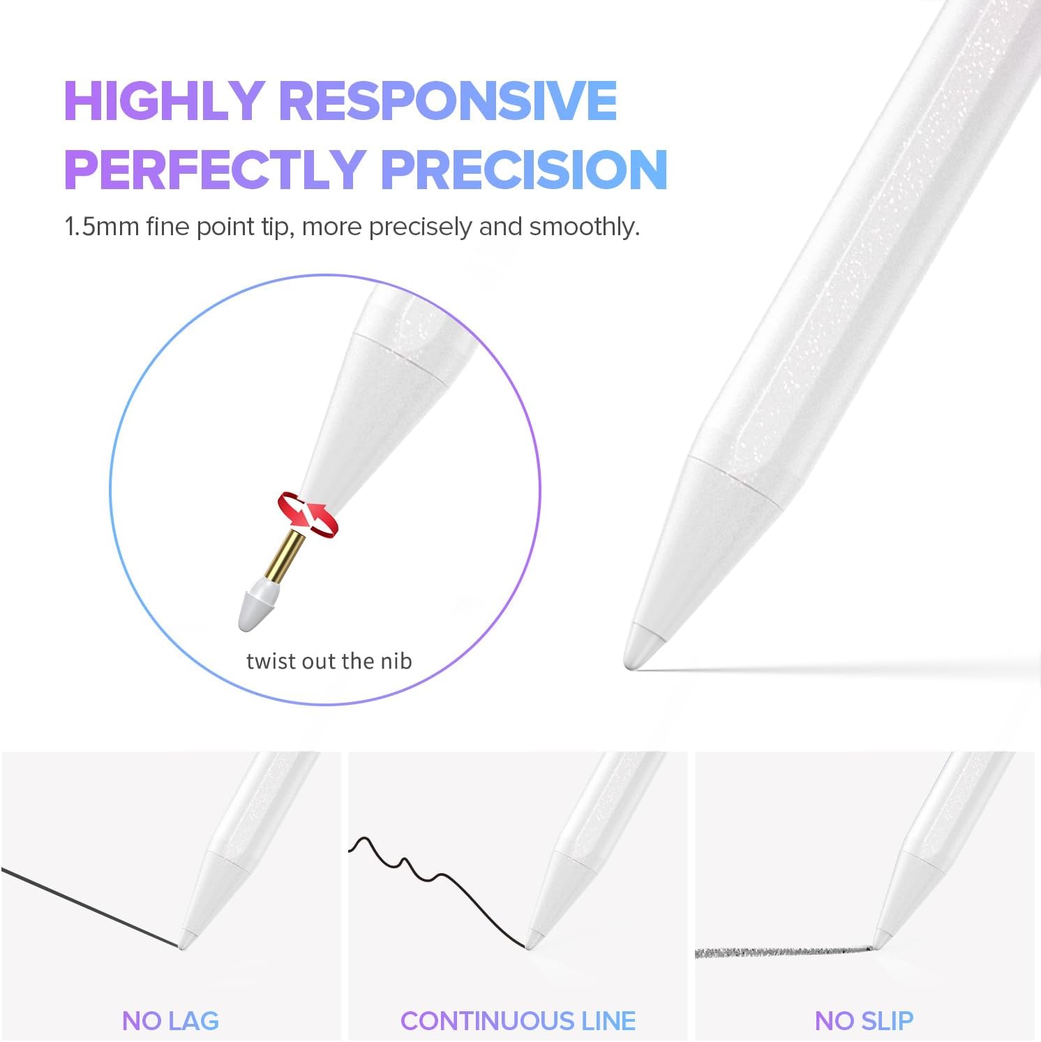 - 【Precise and Smooth】1.5mm pen tip can replace your finger to execute finer instructions, it easy to install and tear off the tips on your stylus pen without any tool. No lag/offset/breaking point!Compared with the ordinary stylus pen, it has higher sensitivity, more accurate signal, more comfortable hand. Not easy to break!【 Note 】The stylus pen no pressure-sensitive design