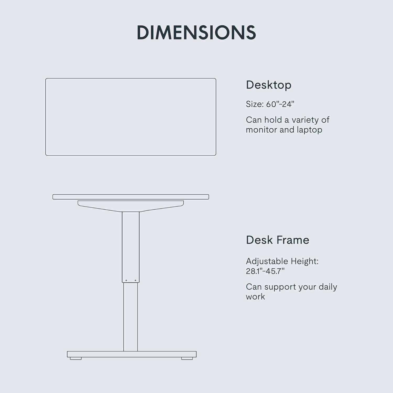 - SMOOTH ELECTRIC HEIGHT ADJUSTMENT: Say goodbye to manual height adjustments. This desk is equipped with an electric lift system that allows you to easily adjust the desk's height from 28.1" to 45.7"(without 1" thickness of table top included). Even better, the motor operates quietly with noise levels below 50 dB, ensuring a peaceful working environment.