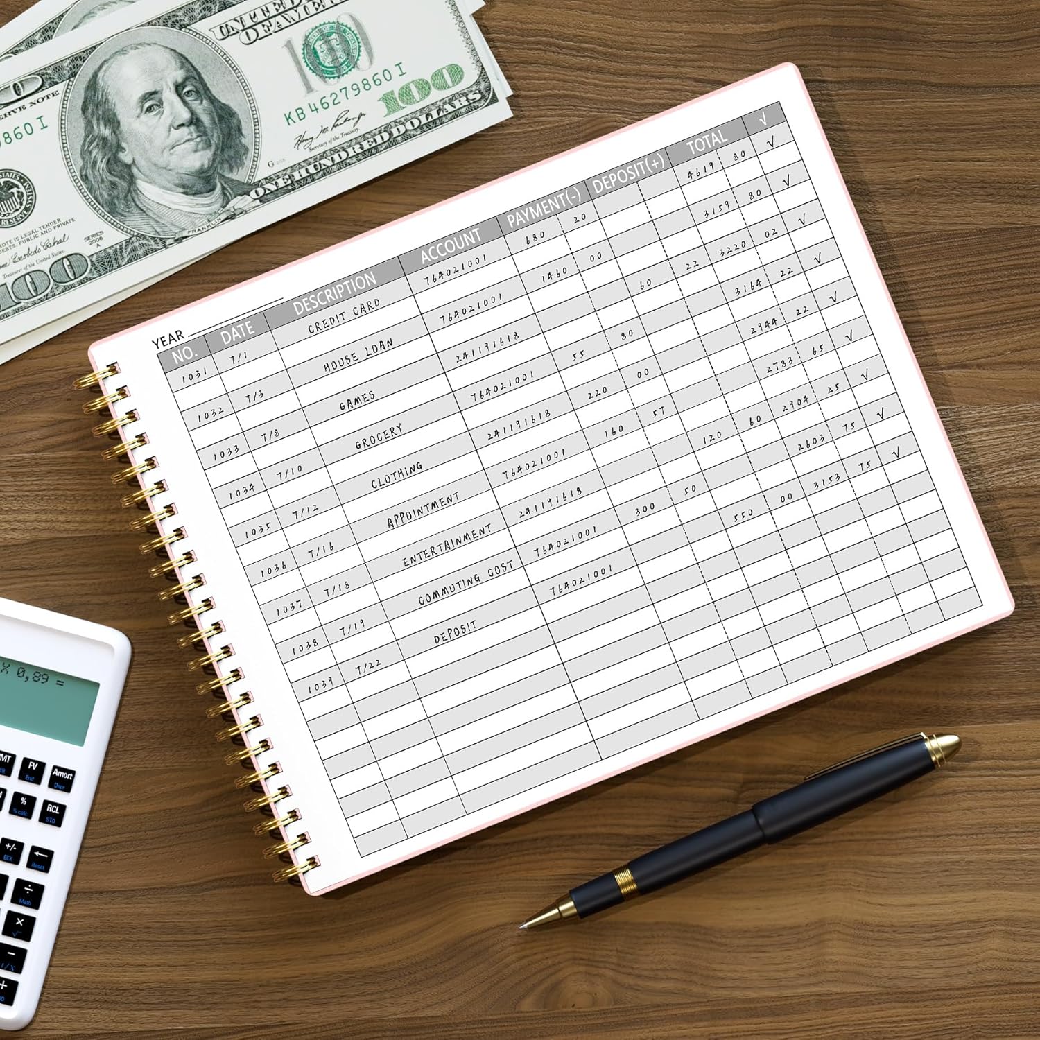 - Portable size, record expenses anytime with ample inner space for transaction details: YEAR, NO., DATE, DESCRIPTION, ACCOUNT, PAYMENT(-), DEPOSIT(+), TOTAL, ✔ , analyze expenses, prepare accurate statements
