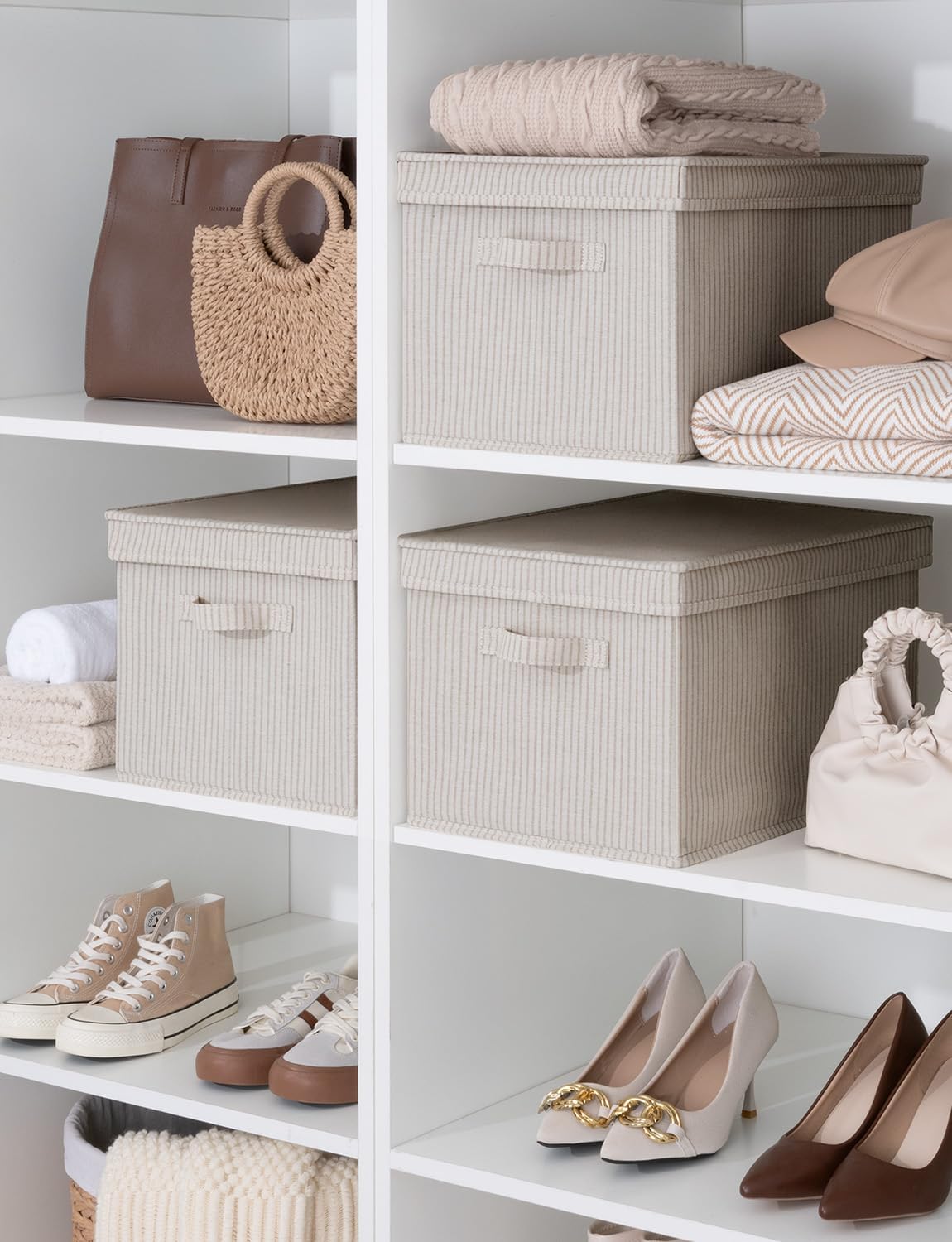 StorageWorks Storage Bins with Lids, Decorative Storage Boxes with Lid and Handles, Foldable Storage Baskets for Closet, Shelves, Stackable, Khaki Stripe, Jumbo, 3-Pack