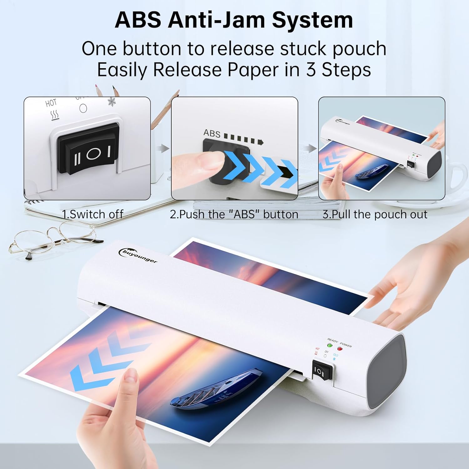 - ABS Anti-Jam Function: The lamination machine equipped with ABS jam release system. When paper jam, simply press the ABS button to release the pinched pockets or papers and then pull them out easily and quickly from the laminator. The ABS anti-jam button resolves paper jam issues effectively and ensures the safety of your files, extending the life of the machine