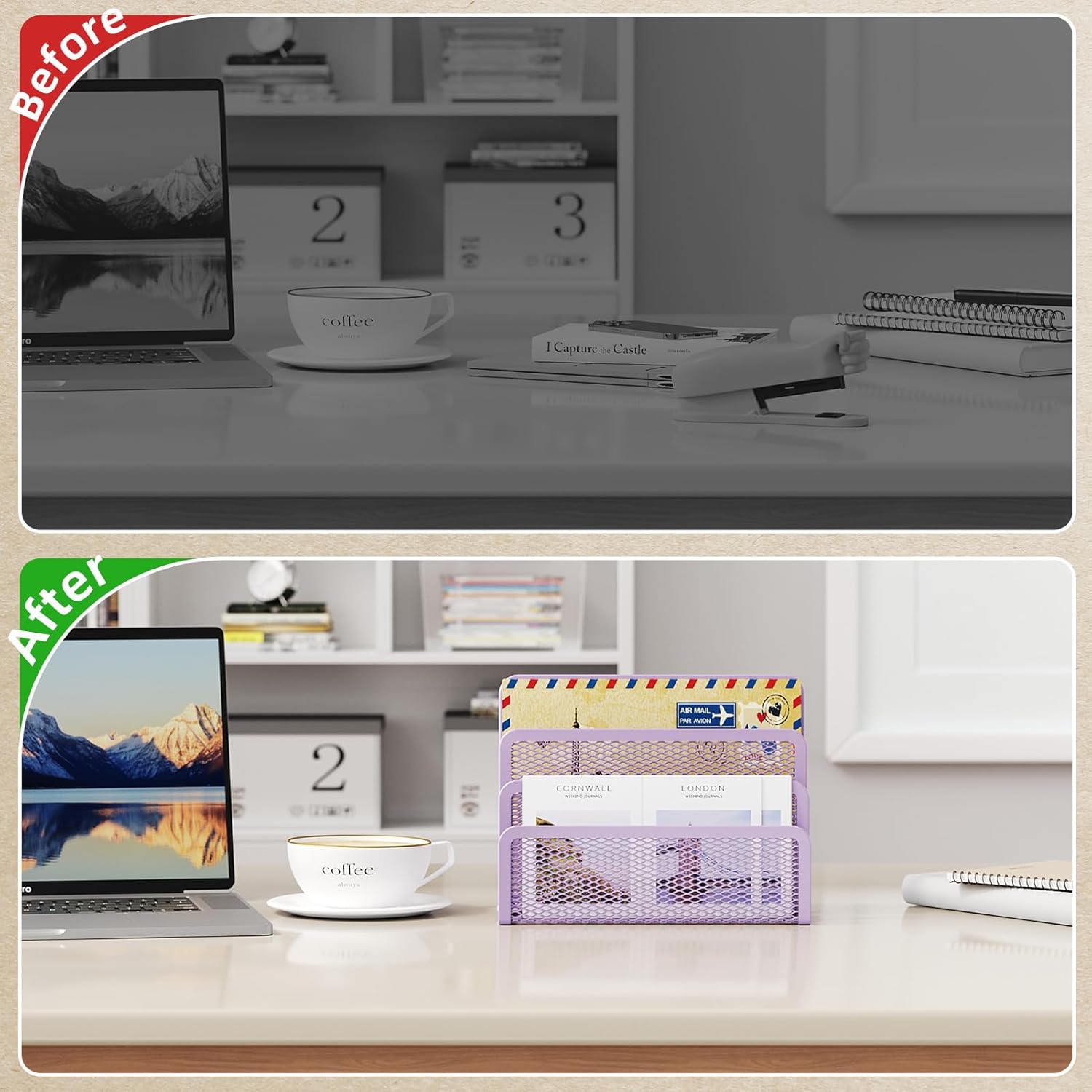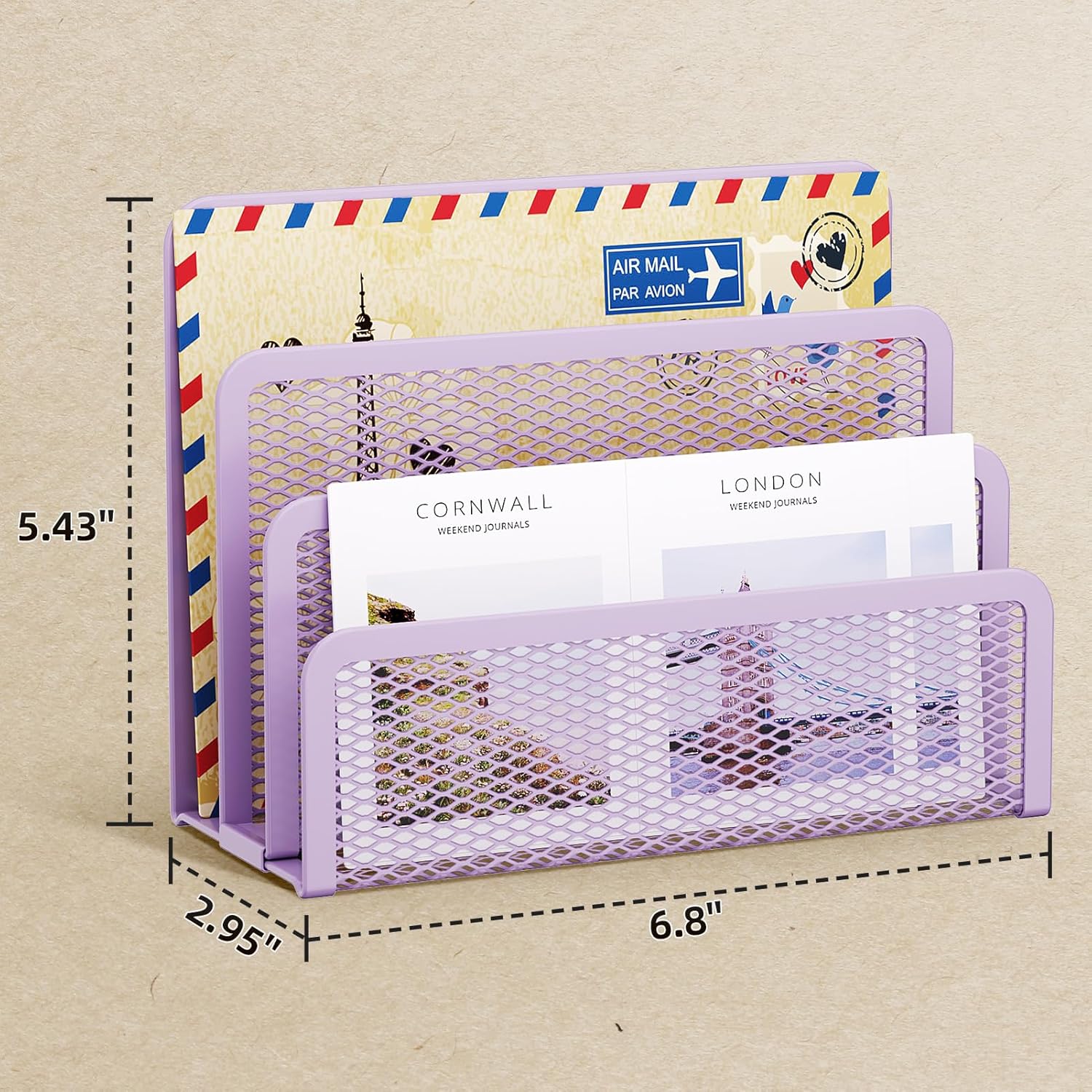 Marbrasse Mail Organizer for Desk, 3-Slot Mesh Metal Mail Holder countertop, Letter Holder, Office Desktop Envelope and Document Storage Rack (Purple)