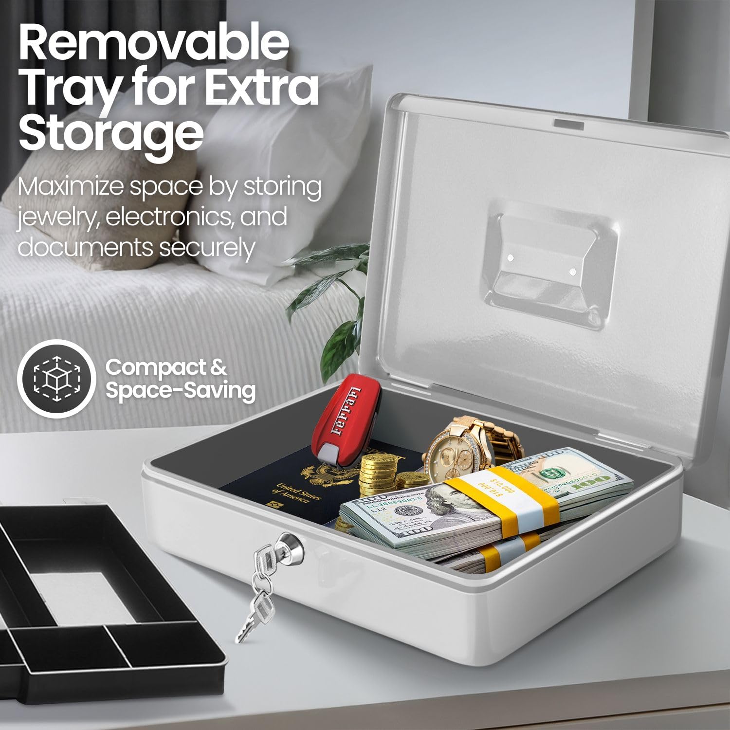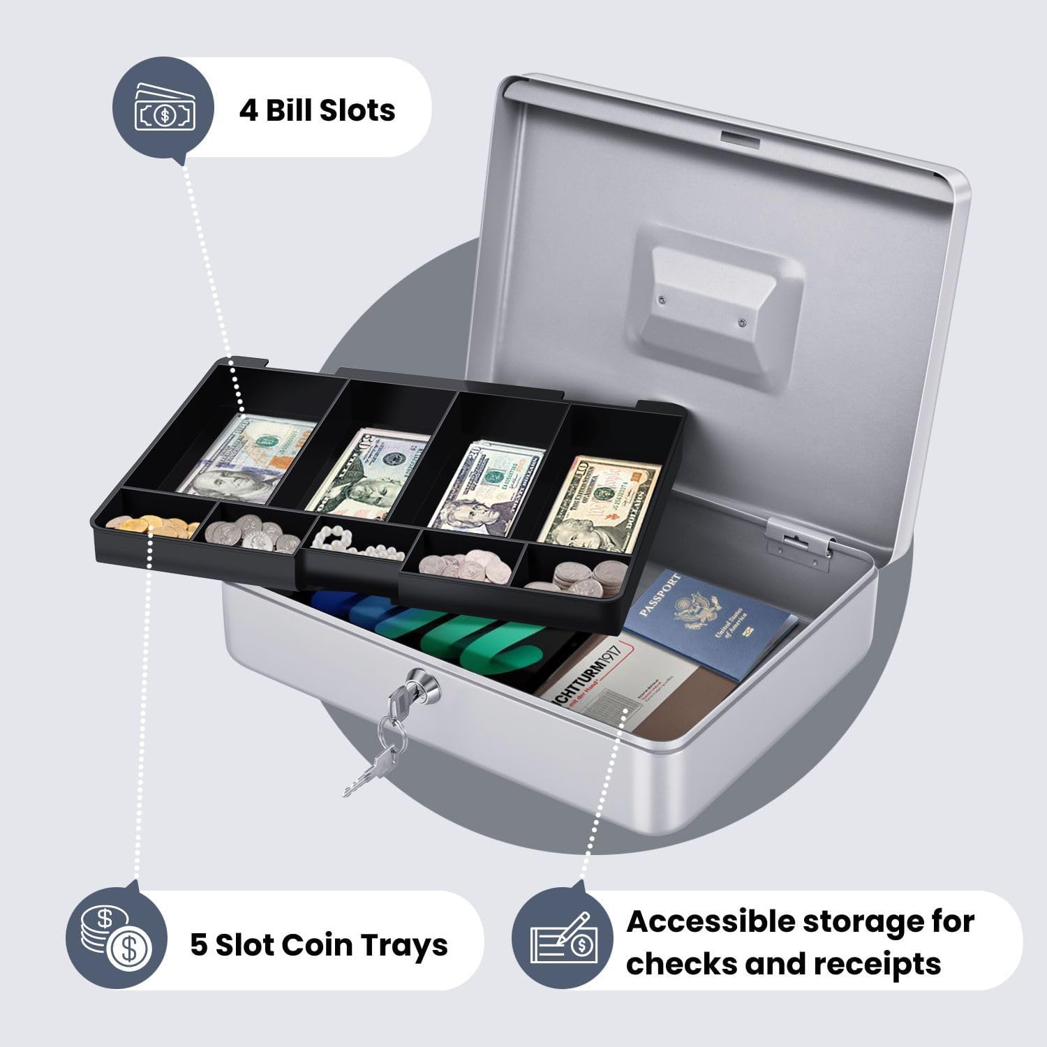 - Organize with Ease - Our money lock box for cash with key features 9 compartment trays to neatly arrange your bills, coins, checks, and other valuables, ensuring quick access and easy counting.