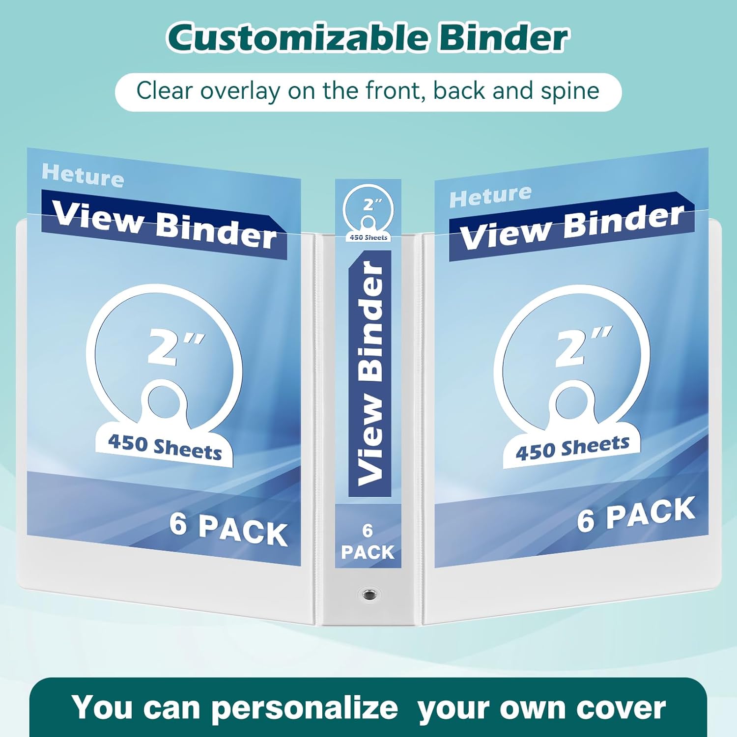 3 Ring Binder 2 Inch 6 Pack,2" Clear View with Round Rings, PVC-Free,Holds for 450 Sheets 8.5X 11 US Letter Size Paper, Durable White Binders Perfect for Office,School and Home