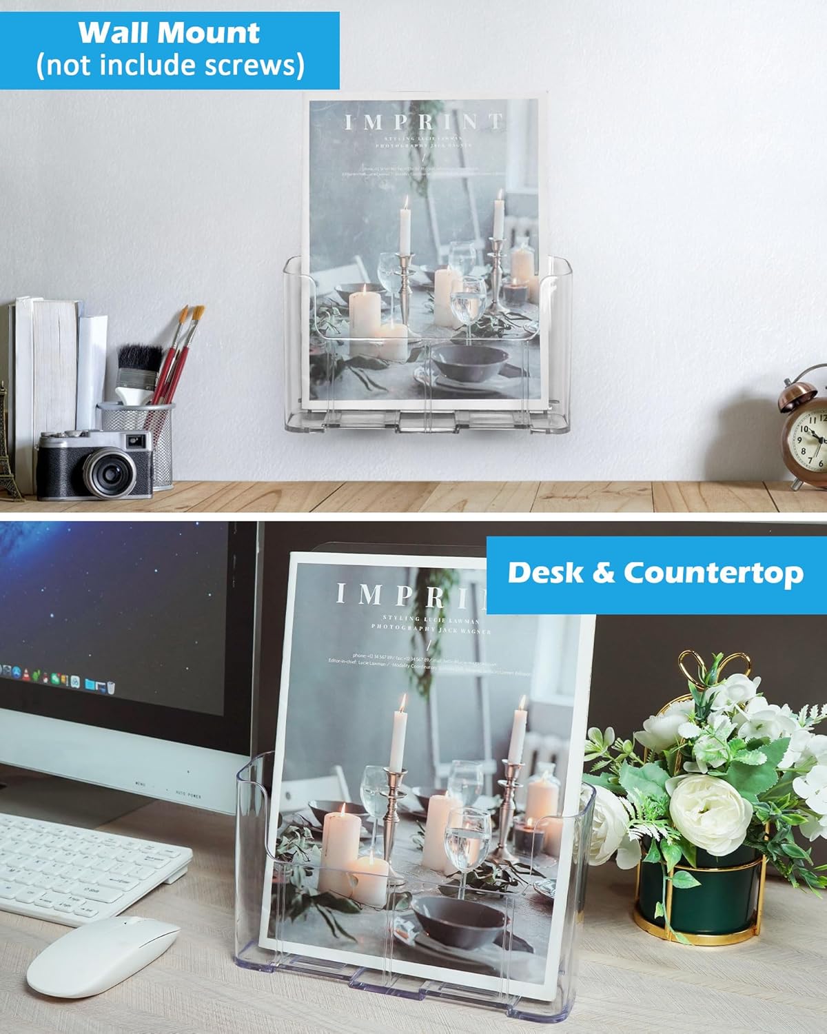 - Stable/Tabletop&Wall Mount: The acrylic display stands features a slanted back design for stability on any desktop. The anti-slip slots keep your brochures neatly displayed and prevent the bottom from curling or warping. Two holes in the back for optional wall mount use