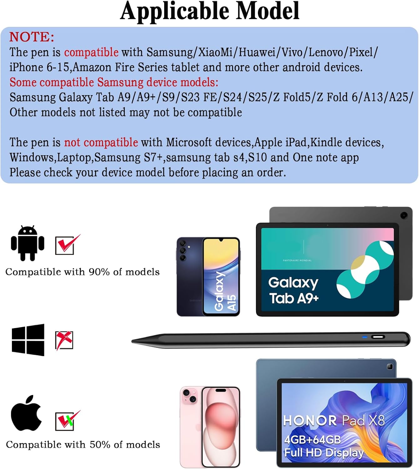 - 【Wide Compatibility】-This stylus pen for touchscreen is universal for capacitive screen electronic products and is specially designed for Android device on the market.The iphone stylus pen is suit with Samsung/XiaoMi/Huawei/Vivo/Lenovo/Pixel/iPhone 6-15 ,Amazon Fire Series tablet and more other android devices. Some compatible Samsung device models-Samsung Galaxy Tab A9/A9+/S9/S23 FE/S24/S25/Z Fold5/Z Fold 6/A13 /A25/ (Note: This lenovo pen is not compatible with Microsoft devices,Apple iPad,Kindle devices,Windows,Laptop,Samsung S7+,samsung tab s4,S10 and One note app. Please check your device model before placing an order.